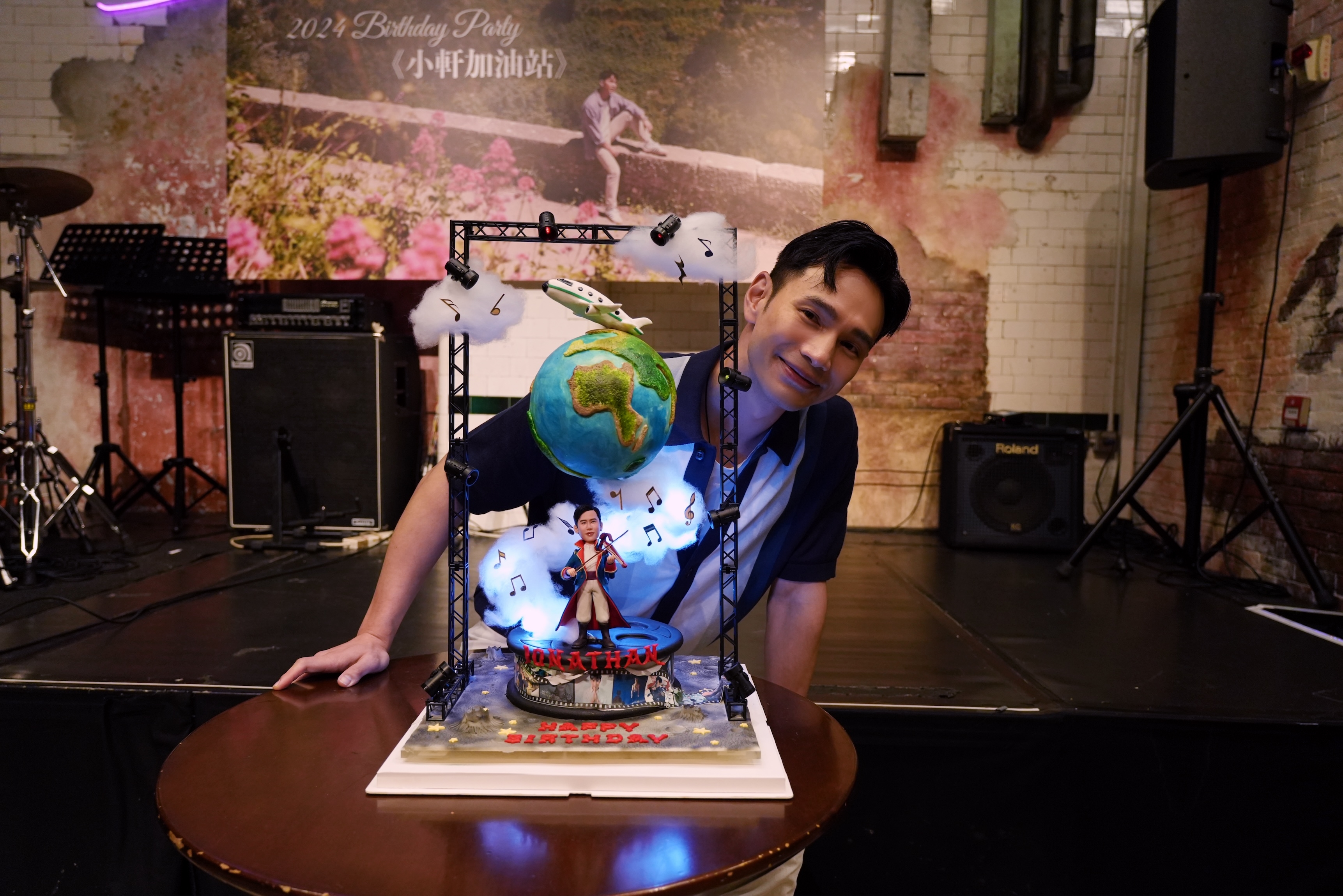 呢日Fans亦為佢準備巨型立體蛋糕,預祝Johnthan歌影視齊飛,壽星亦興奮咁話:「蛋糕底層係菲林,仲整咗我啲相喺度,中間係個舞台,啲音符好似衝上雲霄咁。又有晒射燈,每盞都着到,上面仲有隻飛機環遊全世界。我諗佢哋係寓意我哋嘅歌影視、台前同幕後嘅工作,都可以遍佈地球,好多謝佢哋嘅願景。」