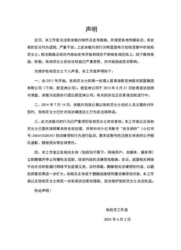 近年轉戰內地嘅 張柏芝 又惹是非,近日前經理人 余毓興 推出新歌影射,又力數對方當年合作時嘅不是。柏芝一方隨即發出聲明,指余偽造公章,又入稟高等法院控告 余毓興 侵犯名譽,要求賠償同道歉。