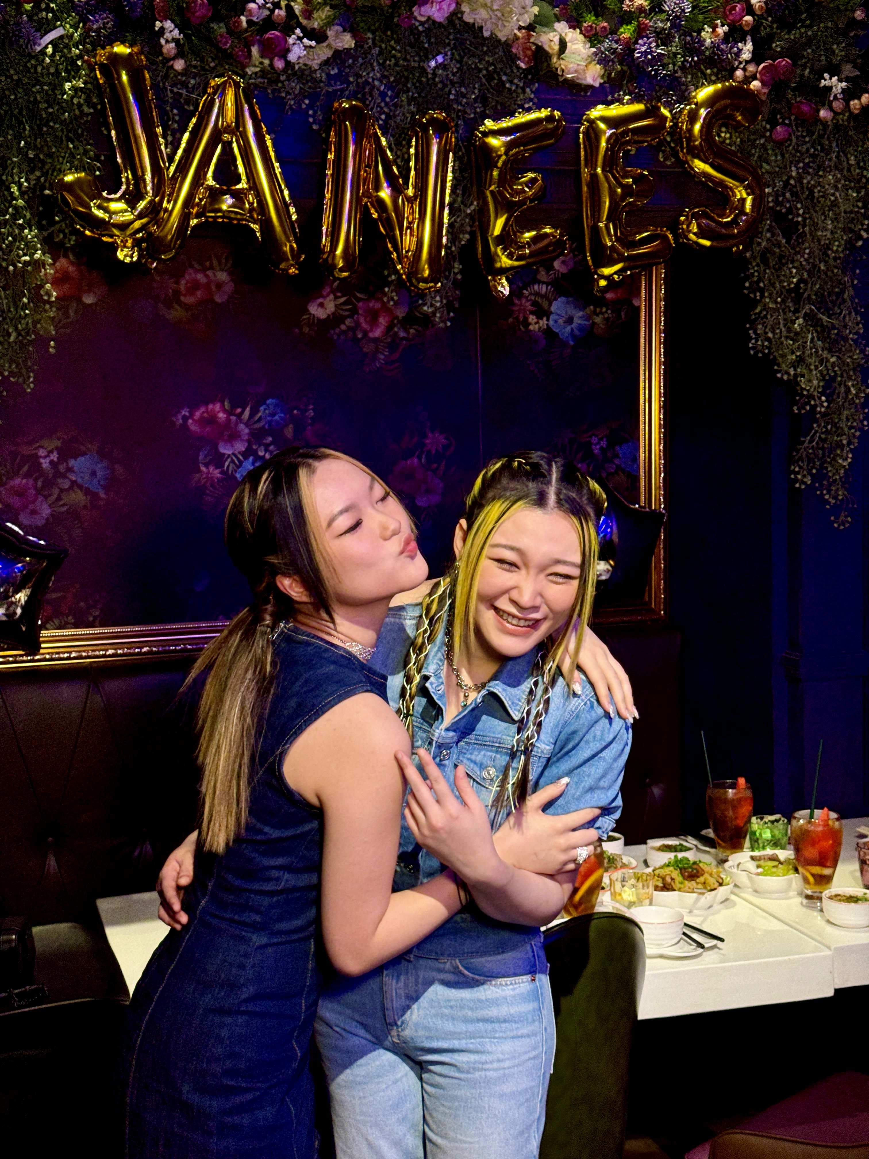 胞妹黃千如(Jasmine)、《聲夢》冼靖峰(Archie)及趙小婷(Pamela),與最近一同拍電視劇《麻雀樂團》嘅梁荺苓(Winter)、郭子健 (Samuel)、陳皓雲(Howard),與「妍究生」一同為Janees慶祝生日。![]()