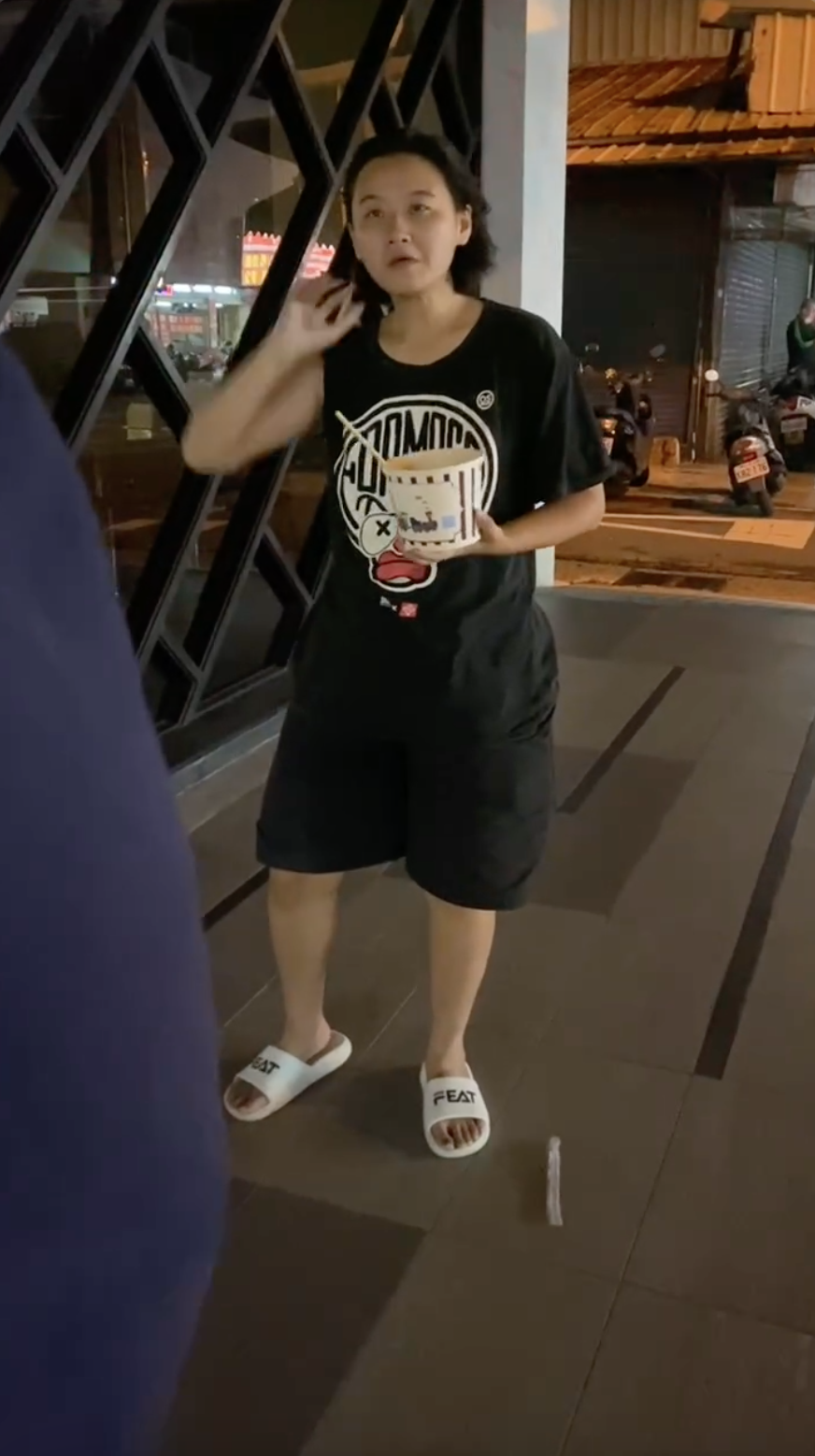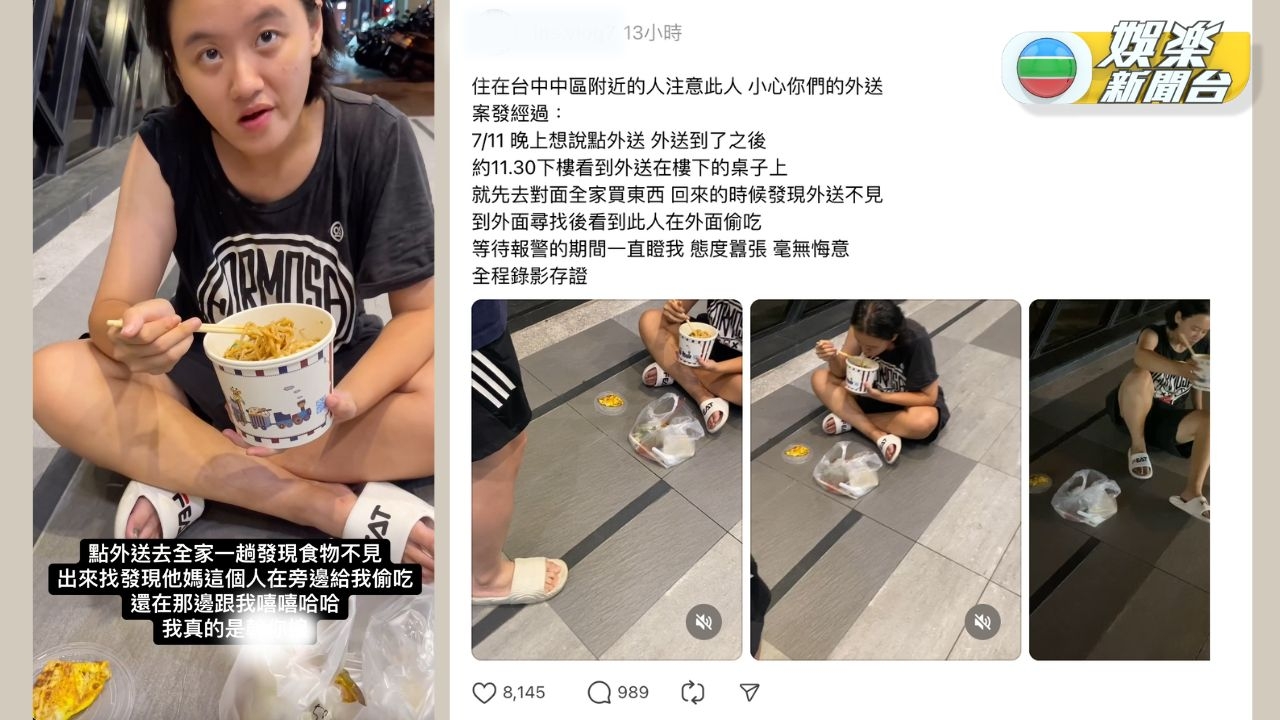 有網民喺社交平台分享一段片,內容見到一位短髮女子坐喺街邊食麵,事主表示自己只係離開一陣,外賣就俾呢位女子偷走,而且當街大快朵頤,佢唯有報警處理,而期間該名女子毫無悔意,繼續大啖食麵,仲不時怒啤事主。![]()