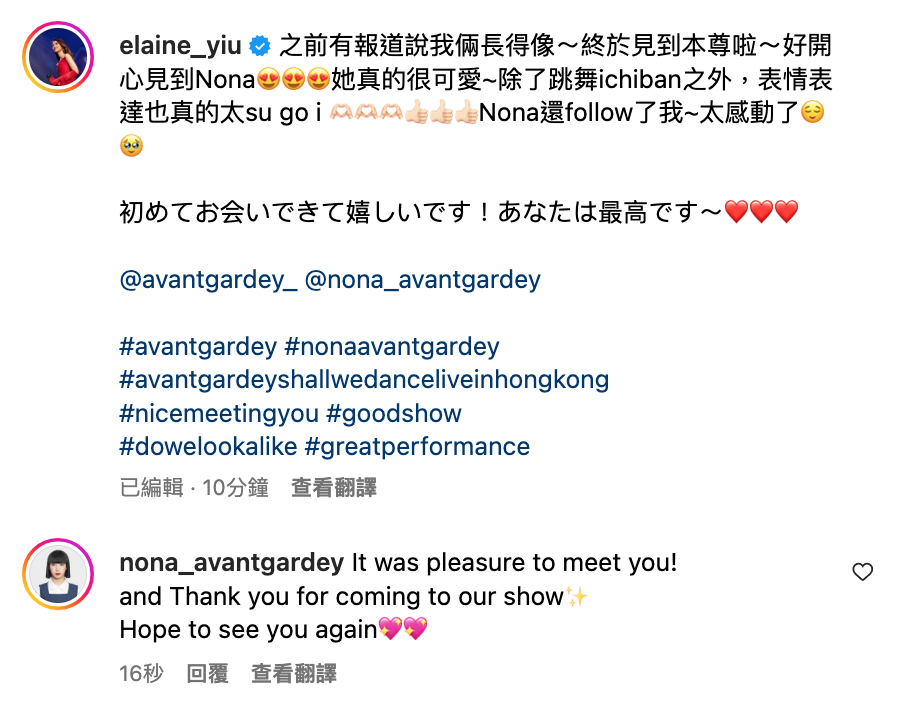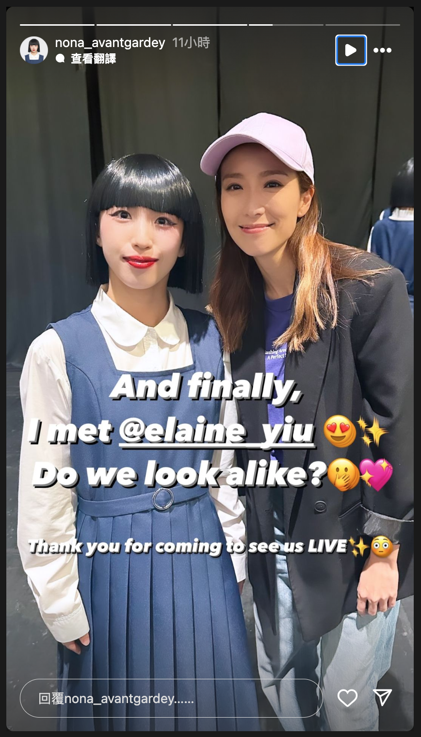 子羚今日(22號)喺社交平台post出佢哋嘅合照,並喺帖文中表示:「 之前有報道說我倆長得像~終於見到本尊啦~好開心見到Nona😍😍😍她真的很可愛~除了跳舞ichiban之外,表情表達也真的太su go i 🫶🏻🫶🏻🫶🏻👍🏻👍🏻👍🏻Nona還follow了我~太感動了😌🥹初めてお会いできて嬉しいです!あなたは最高です~❤️❤️❤️」![]()