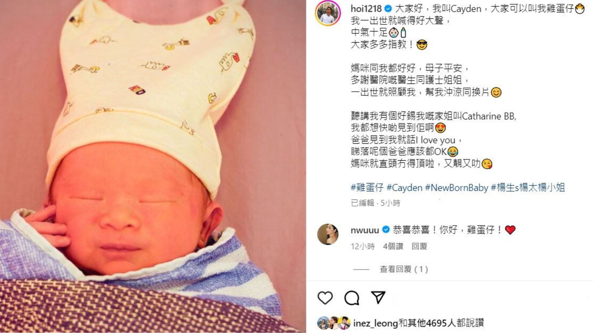 恭喜恭喜…楊潮凱宣布老婆順利誕下第二胎囝囝,英文名取名Cayden,暱稱雞蛋仔,仲話BB一出世就喊得好大聲,中氣十足,相中見BB三隻手指仔輕貼面頰,露出窩心嘅笑容,可愛到不得了。![]()