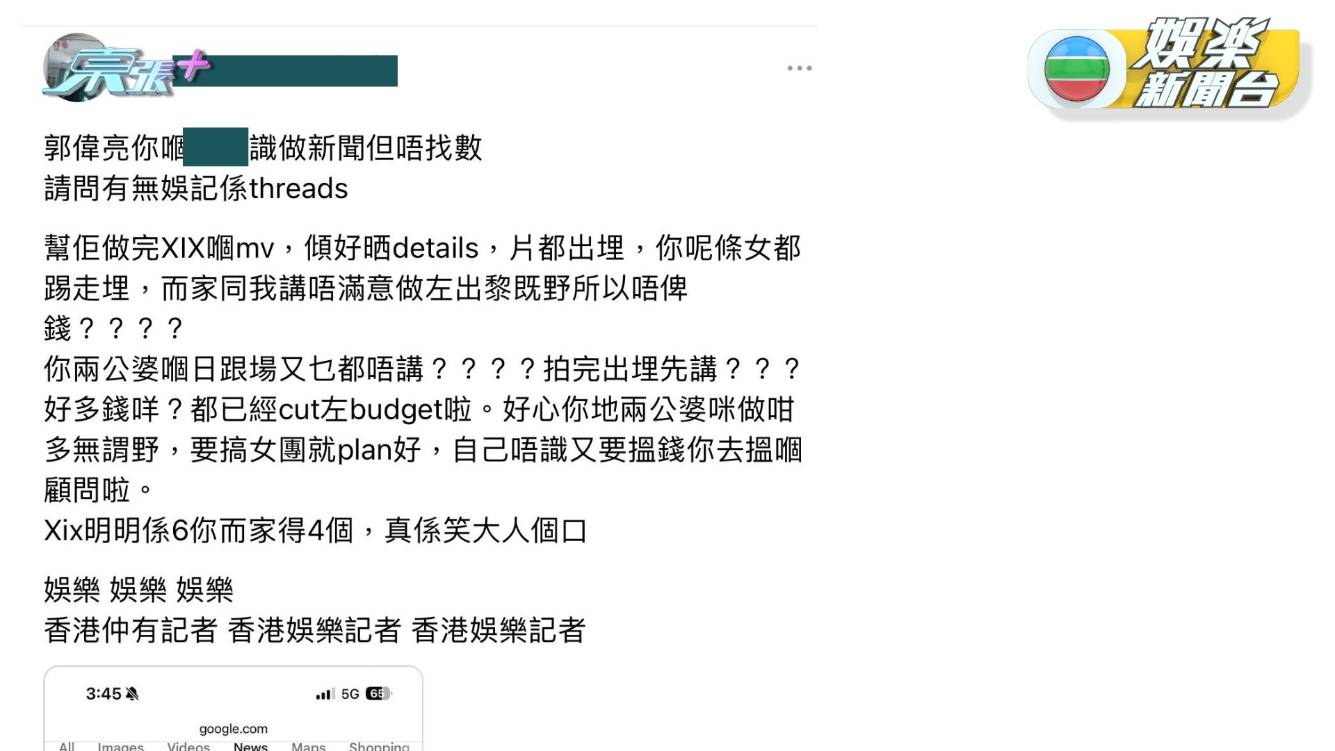 該網民喺網上發文聲稱幫手拍完MV傾好晒details,「片都出埋,你呢條女都踢走埋,而家同我講唔滿意做咗出嚟嘅嘢所以唔畀錢」,該網民又指「好多錢咩?已經cut咗budget啦。好心你哋兩公婆咪做咁多無謂嘢,要搞女團就plan好,自己唔識又要搵錢你去搵嗰顧問啦」。不少網民建議呢位「事主」報《東張》。![]()