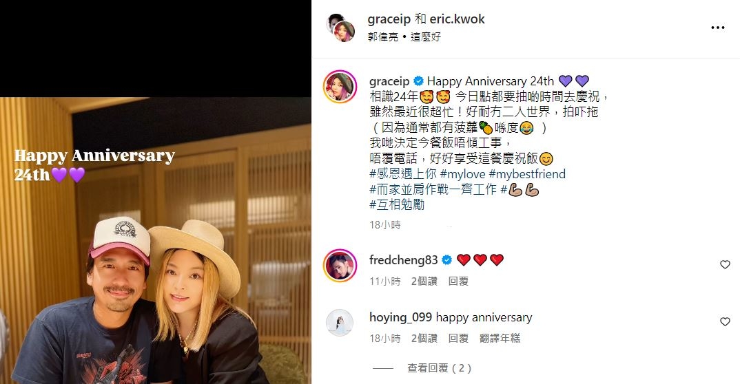 連日因XiX重組而被追訪嘅Eric Kwok同老婆葉佩雯,似乎未有受此事影響心情,今日喺IG貼出二人世界影片,原來佢哋慶祝相識24年,難得抽時間拍吓拖,就決定今餐飯唔傾公事、唔覆電話,好好享受呢餐慶祝飯, 更指感恩遇上對方,而家要並肩作戰一齊工作、互相勉勵。
