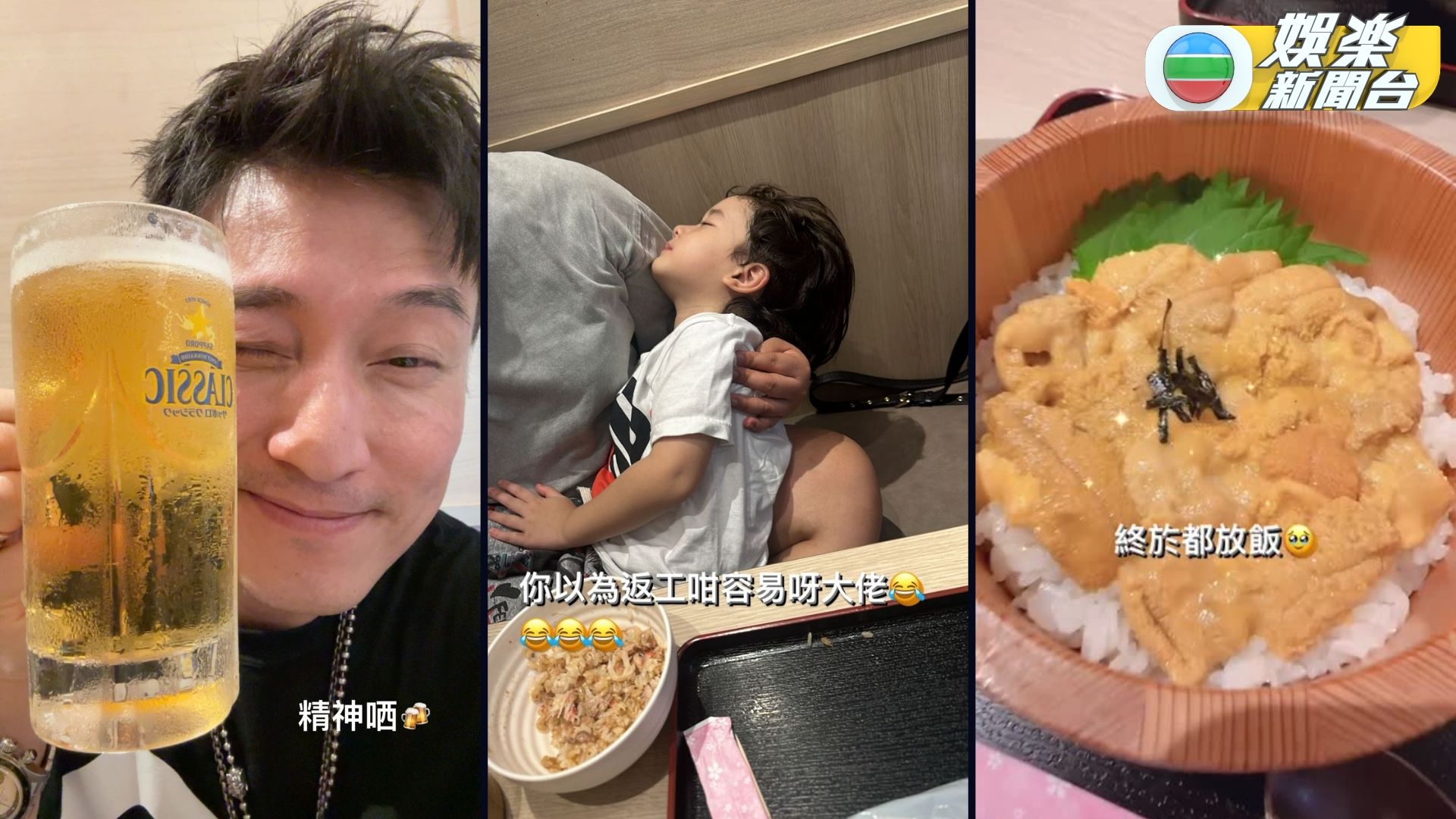 Jaco喺職業體驗樂園忙完一輪,食晚飯嗰陣即「斷電」秒睡,爸爸山聰笑稱:「你以為返工咁容易呀大佬。」山聰終於有MeTime,佢開心晒自拍照,見佢飲啤酒嘆海膽飯,終於可以享受美食!![]()