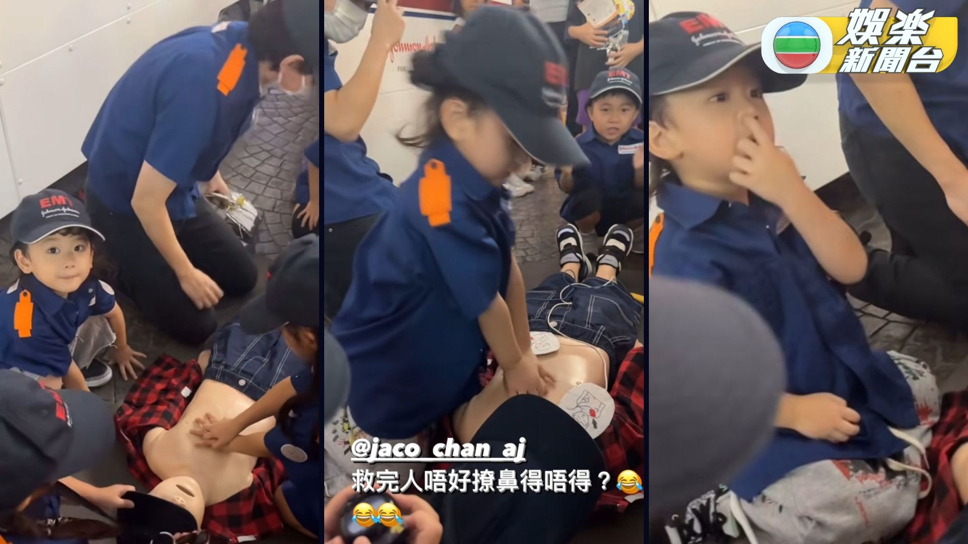山聰今日喺IG動態分享多條阿仔嘅影片,見Jaco扮消防員救火、救護員急救做心外壓等角色,Jaco都跟足指示做得似模似樣,不過山聰見阿仔做完心外壓即撩鼻,阿爸山聰都忍唔住笑稱「救完人唔好撩鼻得唔得」。![]()