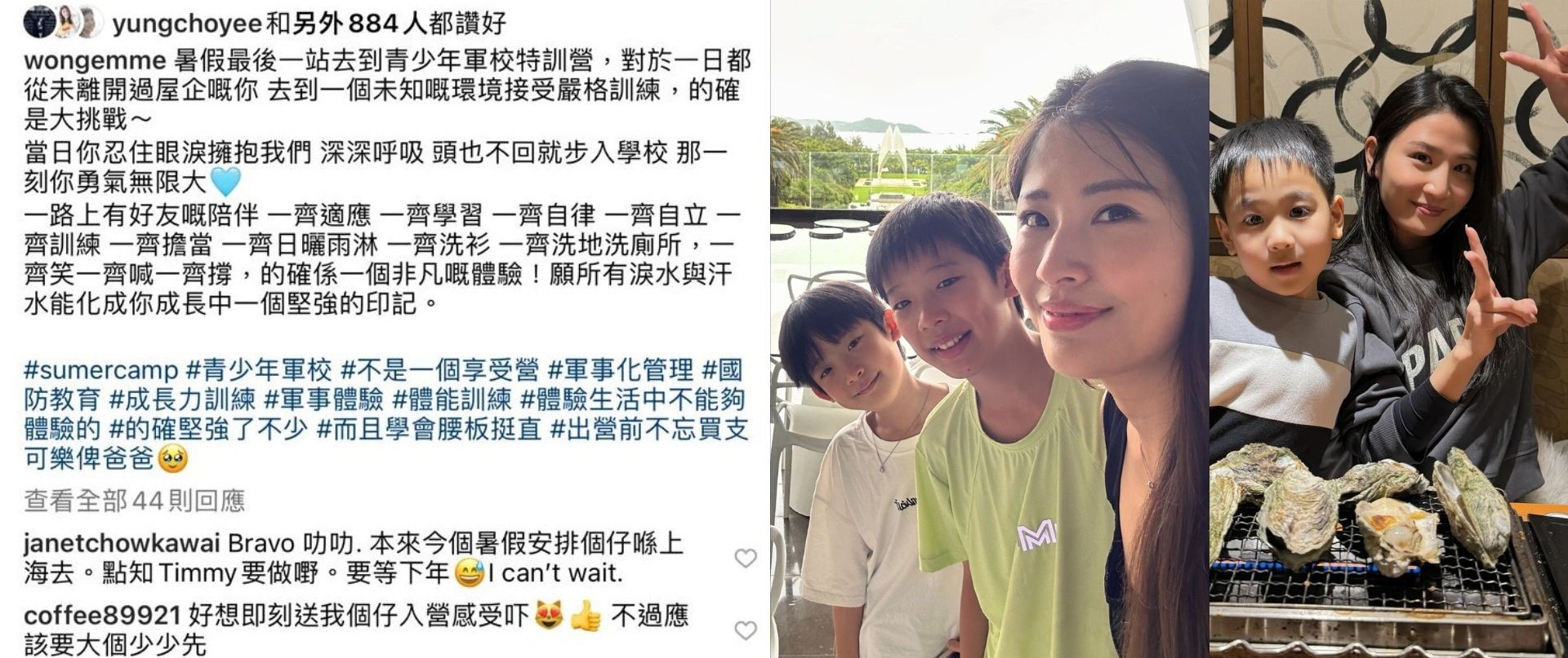 黃依汶亦撰文指阿仔喺暑假最後一站去青少年軍校特訓營,對於一日都從未離開過屋企嘅阿仔嚟講,去一個未知嘅環境接受嚴格訓練,的確係好大挑戰:「當日你忍住眼淚擁抱我們,深深呼吸, 頭也不回就步入學校,那一刻你勇氣無限大。」![]()