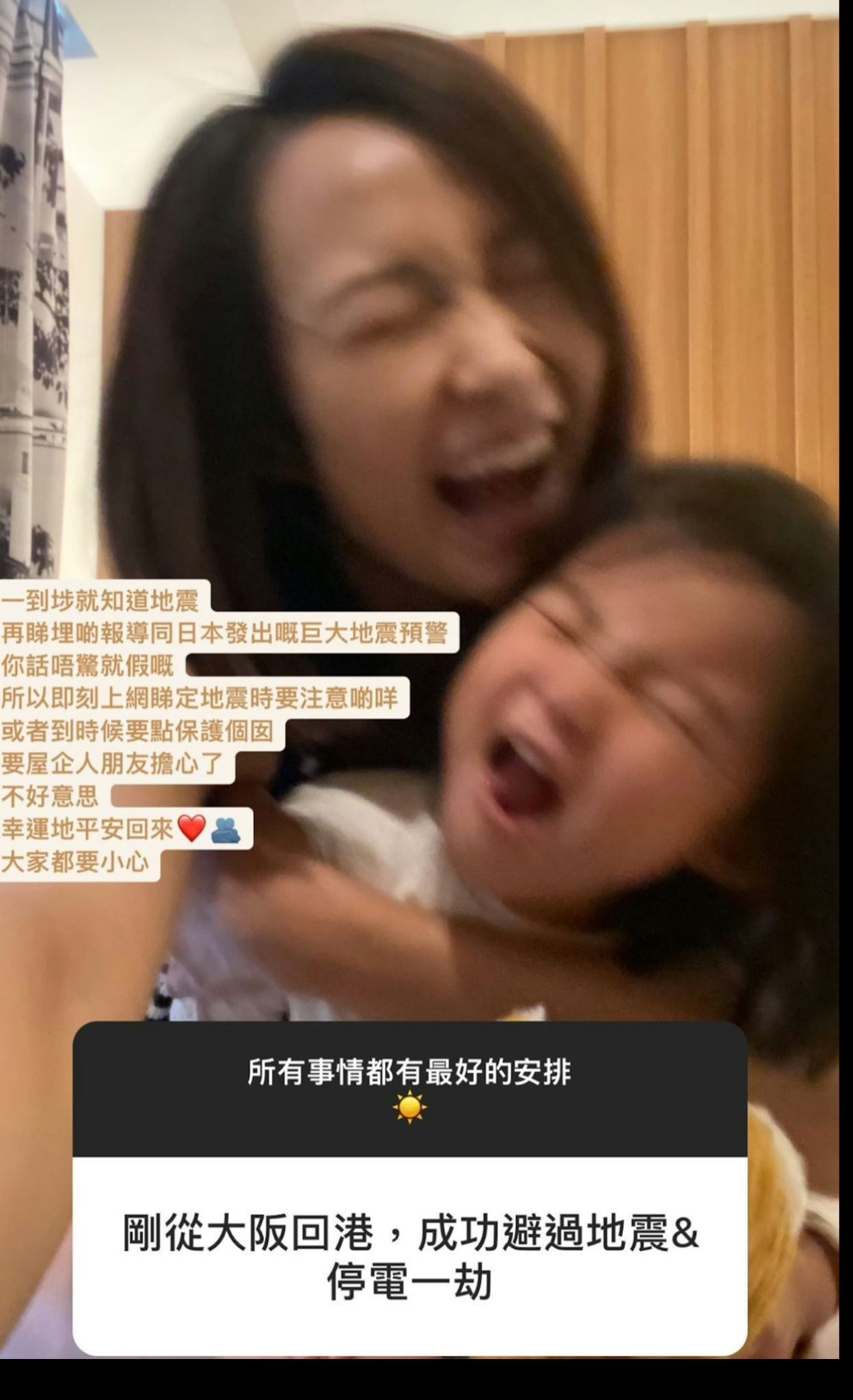 除此之外,湯怡一家遊日嗰陣,咁啱日本發生地震,再加上當地發出巨大地震預警,所以佢話家人同朋友都好擔心佢哋,但話佢哋一家三口已平安回家,成功避過地震與停電一劫,仲話所有事情都有最好的安排。![]()