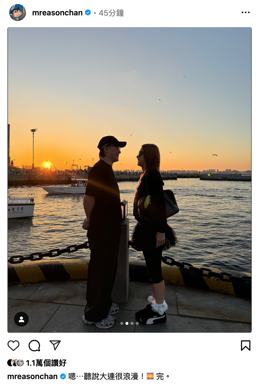 Eason喺29號罕有地於社交平台post出同老婆徐濠縈嘅合照,相中陳氏夫婦喺夕陽下面對面企喺碼頭邊,Eason同徐濠縈都笑得相當燦爛,而喺帖文中Eason寫道:「嗯⋯聽說大連很浪漫!🌅 完。」