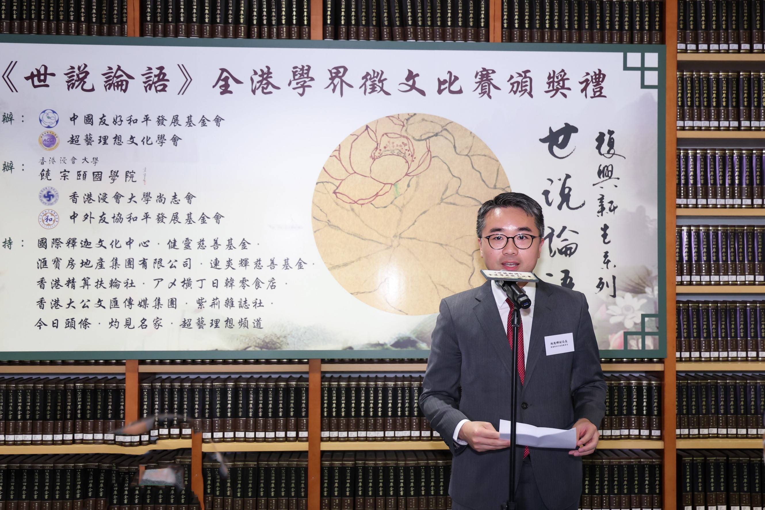 陳復生致謝時表示由2015年開始攝製電視特輯 《世說論語》,至今2024年舉行徵文比賽頒獎禮,剛好10年,真正體驗《論語》 金句「德不孤,必有鄰」。呢次由首席評審何文滙教授及總評審陳致教授選出19位優勝者,包括大學組、高中組、初中組嘅冠亞季軍共9名及優異獎共10名。