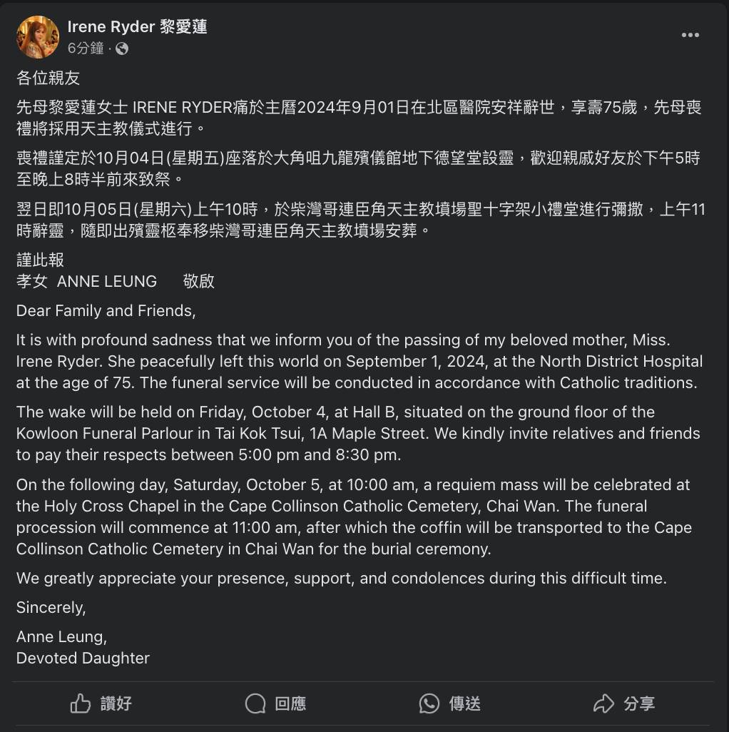 70年代中英混血兒著名歌手,梁小龍前妻Irene Ryder黎愛蓮於9月1日於北區醫院安祥離世,享年75歲,其女兒Anne發出訃聞,公布亡母喪禮定於10月4日假九龍殯儀館地下德望堂設靈,喪禮採用天主教儀式進行,翌日上午10時於柴灣哥連臣角天主教墳場聖十字架小禮堂進行彌撒,上午11時辭靈。據知家人有感Irene Ryder生前曾受襲擊至頭部及背部嚴重灼傷,因此棄用火葬改為土葬,故靈柩於辭靈禮後奉移柴灣哥連臣角天主教墳場安葬。