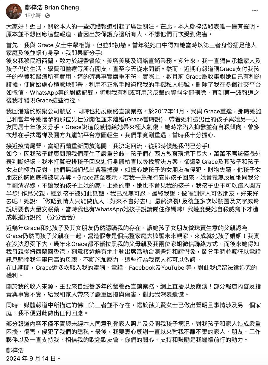 經過連日傳媒報道,孫耀威妹妹孫美賢亦於網上發聲明後,男主角鄭梓浩星期六亦於網上發長文反駁,指Grace處心積慮佈局,又暗示對方情緒勒索,自己金錢支出都係靠個人生意收入得來,反擊對方指自己食軟飯嘅指責,更指率先爆出報道嘅內容與事實不符,聲明全文如下。