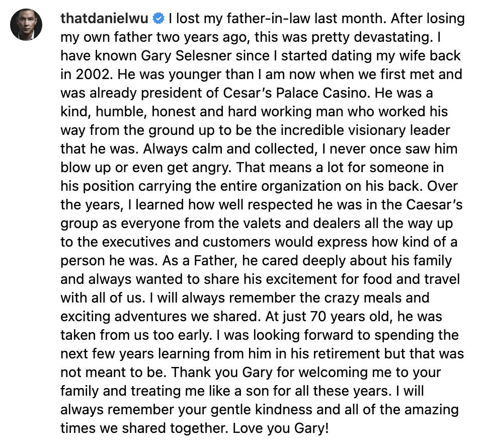 不過Daniel突然於社交平台公佈,曾任職賭城娛樂集團多年嘅主席外父 Gary Selesner 9月初離世,終年70歲,當地傳媒當時亦大肆報道。不時都會分享生活片段嘅Lisa,近個半月都未有更新社交平台。估計由Daniel代表向外界發佈噩耗。![]()