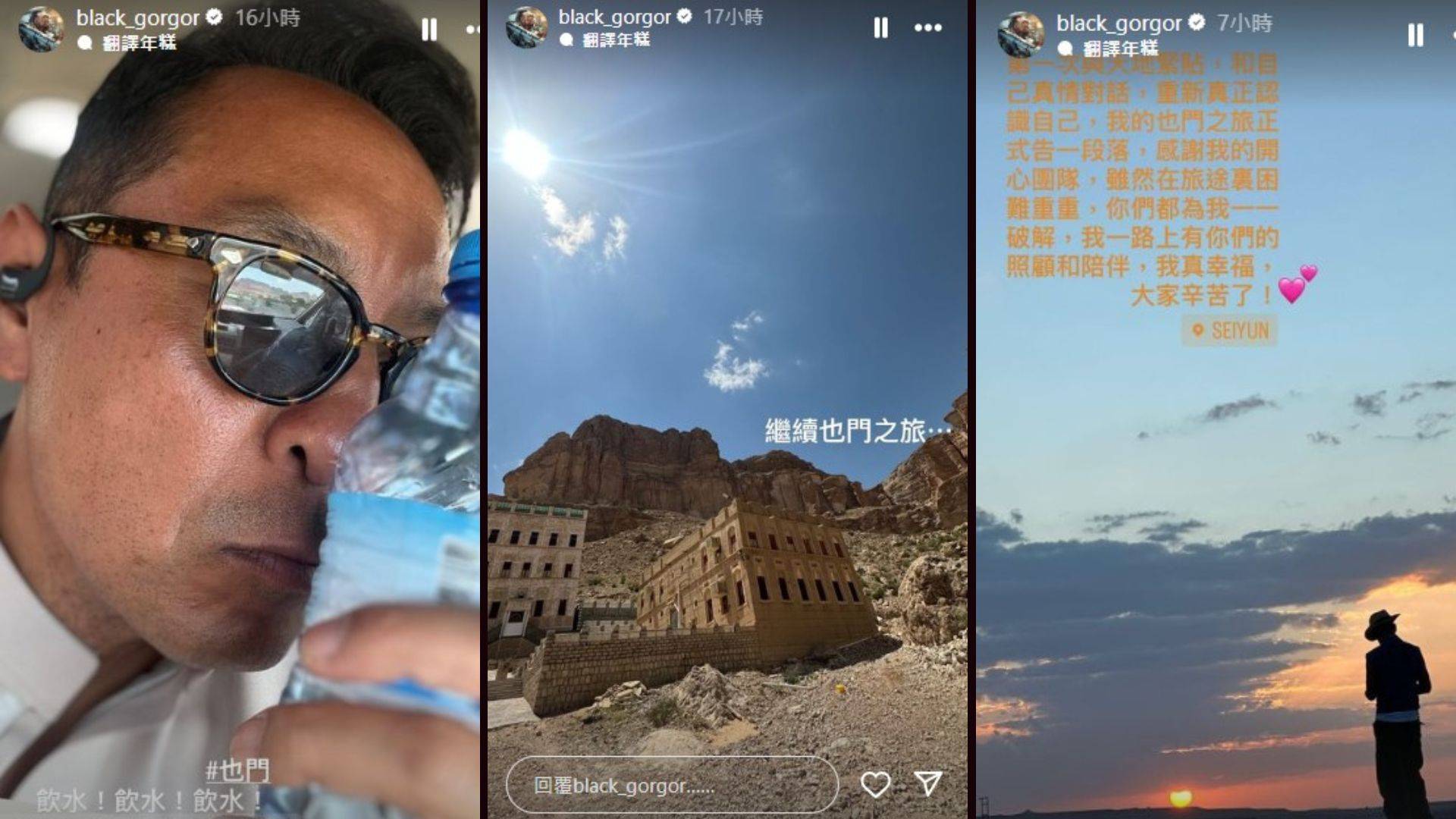 黑哥喺當地喺社交平台分享今次經歷「第一次與天地緊貼,和自己真情對話,重新真正認識自己,一次感動和奇妙的也門之旅,正式告一段落了,我們在這個局勢緊張的地方的確有點艱辛,但一切總算順利渡過,大家不要擔心,非常感謝我的專業又貼心的開心團隊,在旅途上為我排憂解難,我一路上有你們的照顧和陪伴,我真幸福⋯大家辛苦了!」正如黑哥出發前所期待,此行係身心靈之旅,趁呢次難得機會好好了解自己。