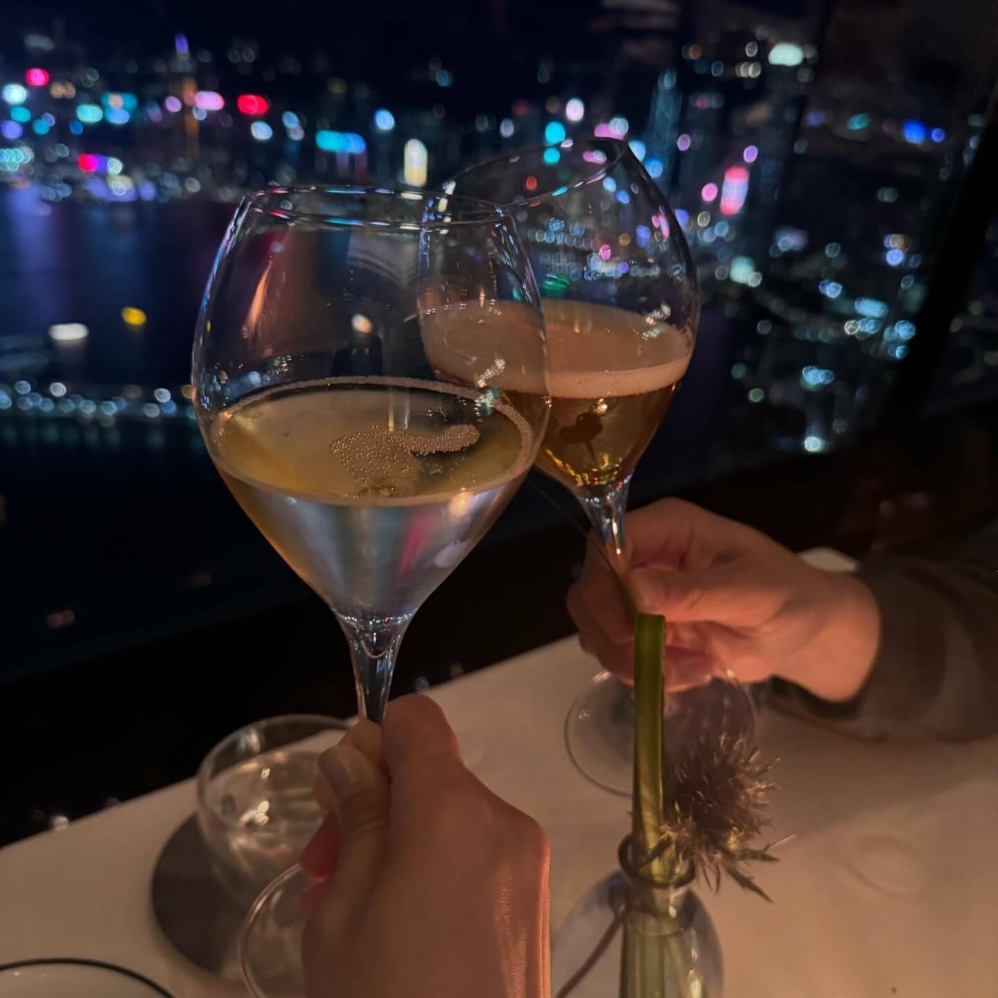 茜堯同子溢坐立於落地玻璃旁邊欣賞香港夜景,一邊嘆美食飲香檳,仲獲贈一對寫上兩人名字嘅公仔,之後到食甜品時,茜堯就輕輕敲破面層朱古力見到一張小小心意卡,睇到上面嘅字眼時茜堯即心花露放。