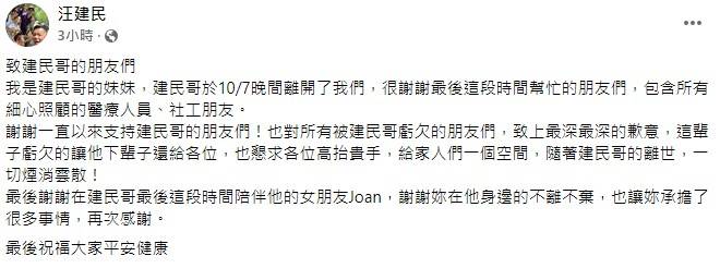 台灣藝人汪建民驚傳因肺腺癌離世,終年56歲。汪建民嘅胞妹透過社交媒體證實哥哥死訊,汪妹寫到:「建民哥於10/7 晚間離開了我們,很謝謝最後這段時間幫忙的朋友們,包含所有細心照顧的醫療人員、社工朋友。謝謝一直以來支持建民哥的朋友們!也對所有被建民哥虧欠的朋友們,致上最深最深的歉意,這輩子虧欠的讓他下輩子還給各位,也懇求各位高抬貴手,給家人們一個空間,隨著建民哥的離世,一切煙消雲散!」