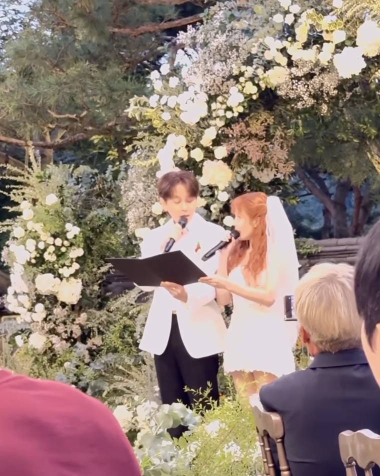 泫雅手持花球以一身由多朵白色花組成嘅露肩短裙式婚紗,挽住爸爸嘅手步入會場,而龍俊亨就身穿白色西裝,之後互相讀出誓詞同交換結婚戒指,然後手牽手一直帶笑,接受在場親友祝賀。