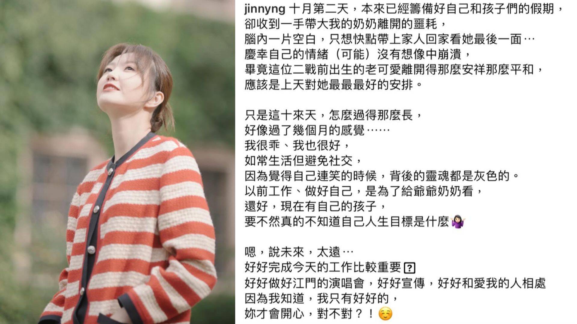 吳若希(Jinny)今早喺網上發文悼念一手湊大佢嘅奶奶離世,指奶奶已離開十幾日,但吳若希心情仍難以平復,如常生活但避免社交,「還好現在有自己的孩子,要不然真的不知道自己人生目標是甚麼」,吳若希希望專注工作,知道自己活得好,奶奶就會開心。