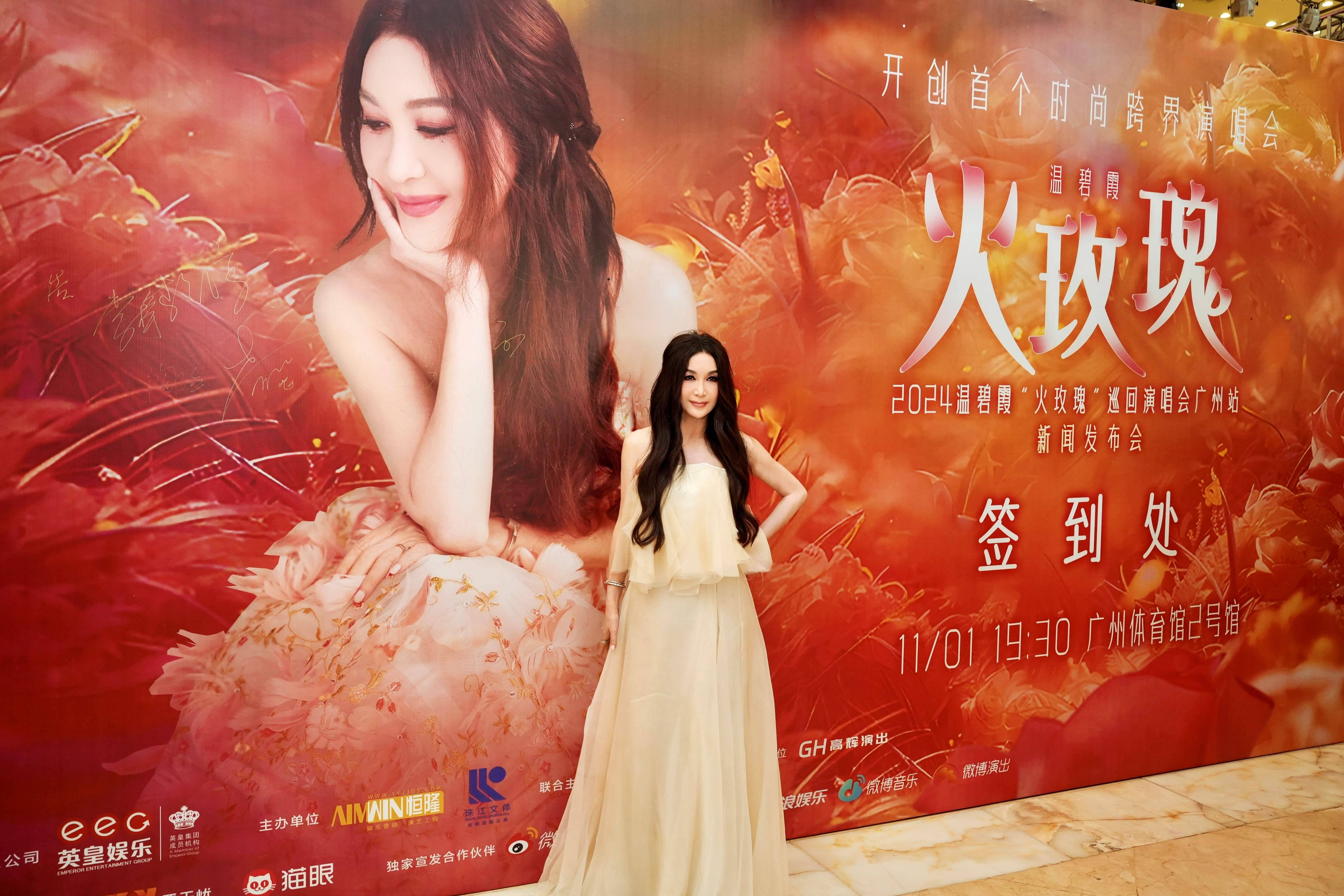 溫碧霞以白色長裙仙氣造型現身廣州,宣布將於11月初展開首次內地巡迴演唱會,第二站將於佛山跟歌迷倒數迎接2025年。演唱會發佈會上,司儀先與「AI 坦己」互動,AI 坦己介紹演唱會內容,今次製作團隊喺美術方面落足功夫,將運用花、雪、海、火,再結合歌曲意境,打造極具穿越感嘅視聽盛宴。