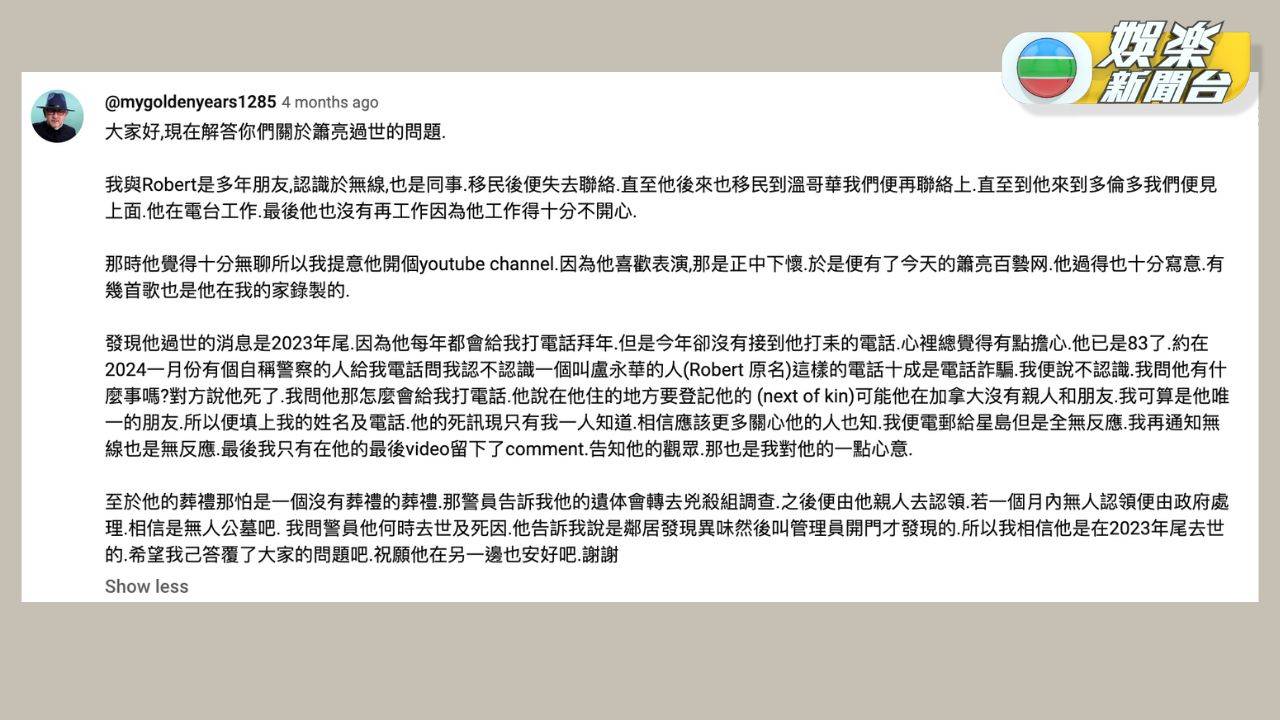 該網名為「My golden years」嘅蕭亮好友,於留言中表示自己喺2024年1月收到自稱係警察嘅人來電,當時對方指一位名為盧永華嘅人死咗:「我問警員他何時去世及死因,他告訴我說是鄰居發現異味然後叫管理員開門才發現的,所以我相信他是在2023年尾去世的。」![]()