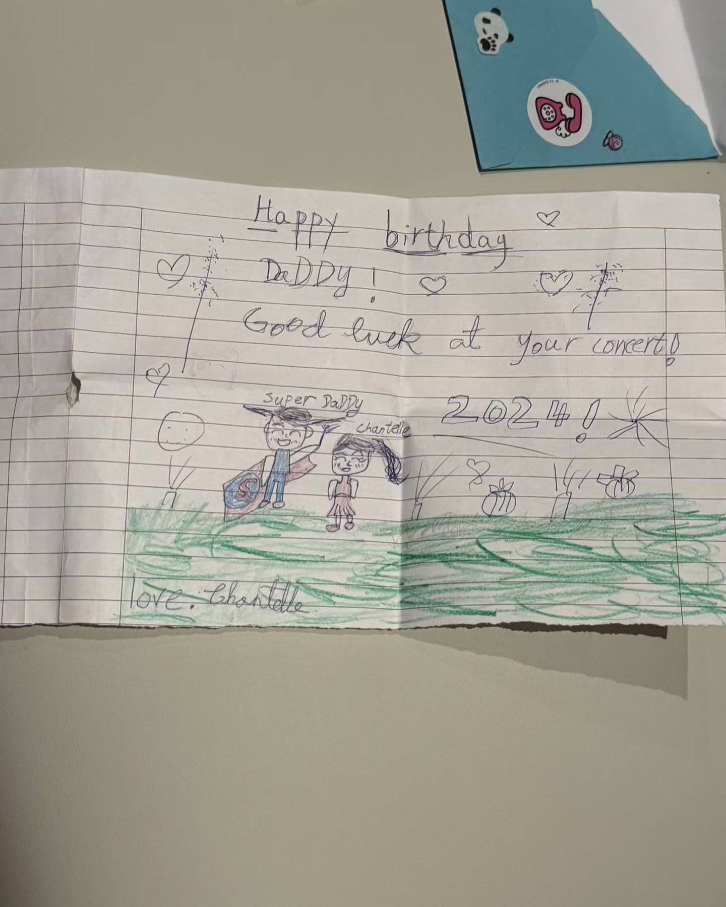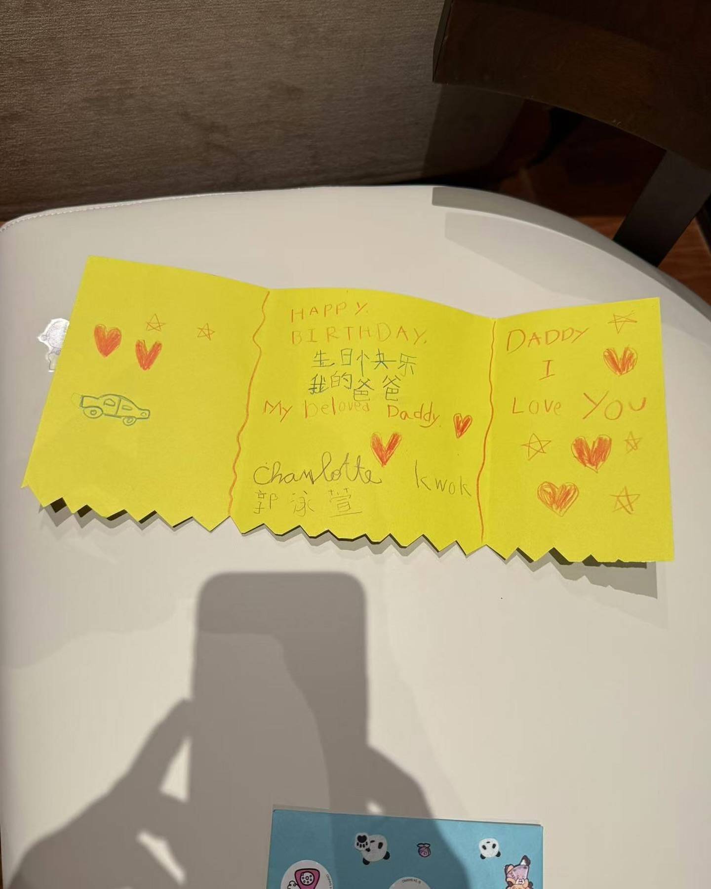 城城多年來收過嘅禮物應該數之不盡,不過相信最為珍貴嘅,一定唔少得兩個囡囡 郭詠希(Chantelle)同郭詠萱(Charlotte)親手機寫嘅生日卡同圖畫喇,大女仲祝Daddy嘅演唱會順利,而方媛仲開心到同老公舞蹈造型嘅蛋糕合照。