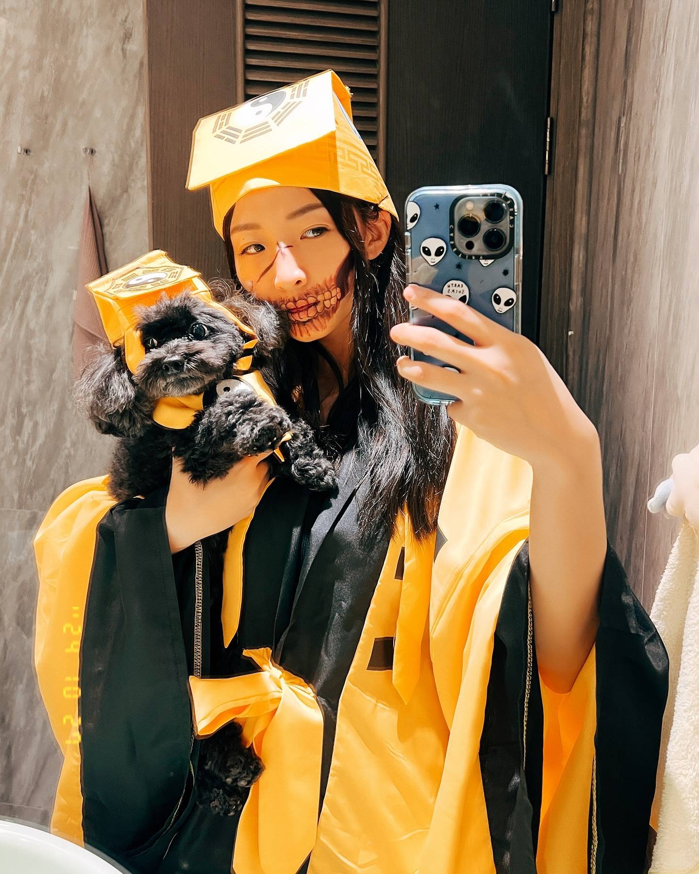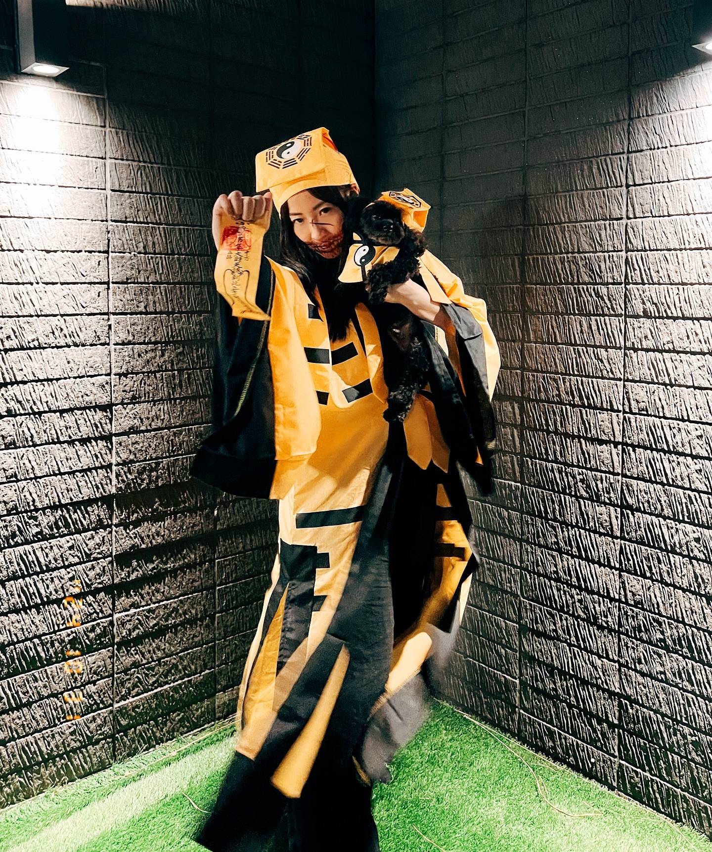 而日前佢就趁住萬聖節,同男友仲有愛犬齊齊化身道士,唔止面上有恐佈化妝,佢哋仲戴晒帽有符仲有法器,合照非常可愛有趣。![]()
