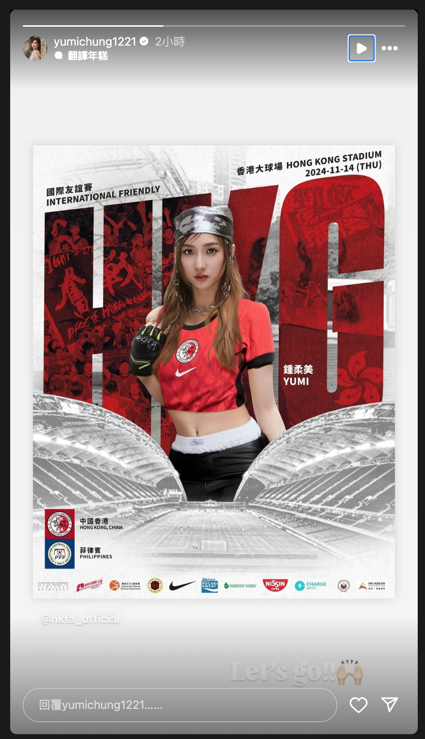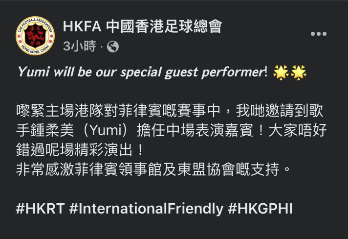 今日(3號)足總喺社交平台公布消息,並post出Yumi任表演嘉賓嘅海報,於帖文中表示:「𝙔𝙪𝙢𝙞 𝙬𝙞𝙡𝙡 𝙗𝙚 𝙤𝙪𝙧 𝙨𝙥𝙚𝙘𝙞𝙖𝙡 𝙜𝙪𝙚𝙨𝙩 𝙥𝙚𝙧𝙛𝙤𝙧𝙢𝙚𝙧! 🌟🌟嚟緊主場港隊對菲律賓嘅賽事中,我哋邀請到歌手鍾柔美(Yumi)擔任中場表演嘉賓!大家唔好錯過呢場精彩演出!非常感激菲律賓領事館及東盟協會嘅支持。」而Yumi亦於IG嘅限時動態轉發消息,仲寫住:「Let’s go!!🙌🏼」叫大家支持。![]()