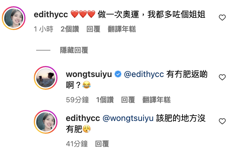 龔嘉欣指翠如係一個人人愛嘅小天使,令翠如冧到大讚嘉欣呢段話好So sweeet ,至於莊琬晴就話「做一次奧運,我都多咗個姐姐」嚟形容自己對翠如嘅感覺,翠如亦發揮「姐姐」身份問Edith有冇肥返啲,互動真係好貼心!