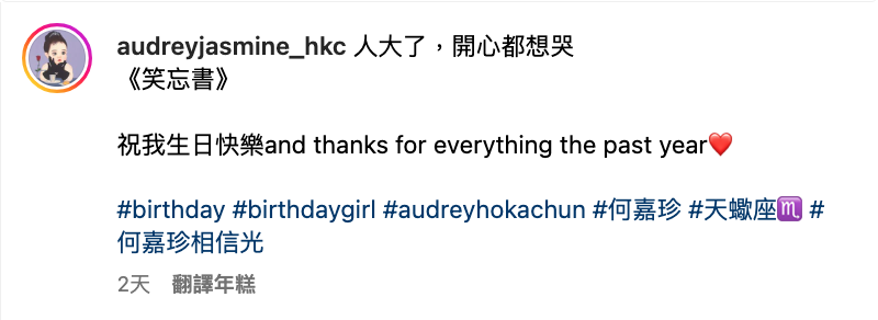 不時會引用歌詞嘅Jasmine,今次就引用張敬軒《笑忘書》中嘅一句「人大了 開心都想哭」放喺帖文入面,並寫道:「祝我生日快樂and thanks for everything the past year❤️」。![]()