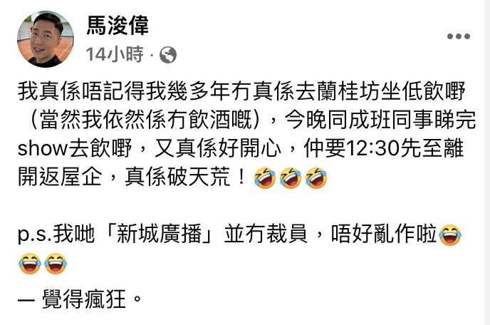 馬仔喺呢個高層Post仲話:「我真係唔記得我幾多年冇真係去蘭桂坊坐低飲嘢(當然我依然係冇飲酒嘅),今晚同成班同事睇完show去飲嘢,又真係好開心,仲要12:30先至離開返屋企,真係破天荒!」幾大高層坐低飲嘢,傾咩馬仔就冇講,不過個Post就有最緊要嘅一句喇:我哋「新城廣播」並冇裁員,唔好亂作啦