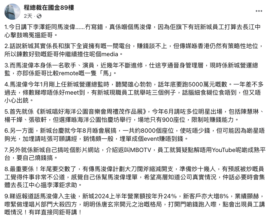 雖然埋位未夠一年,有指馬仔入主後成績不俗,當時佢亦指未有裁員計畫,不過近日就有網上消息指,新城有員工求助,指稱年內難以達到馬總監嘅5000萬營業額要求,亦對年內電台舉行嘅音樂會安排,仲有網上平台嘅營運有唔同睇法,仲話臨近年尾,馬仔因需「做靚盤數」而有意削減開支,仲有傳將向十多位員工派大信封將佢哋辭退云云。![]()
