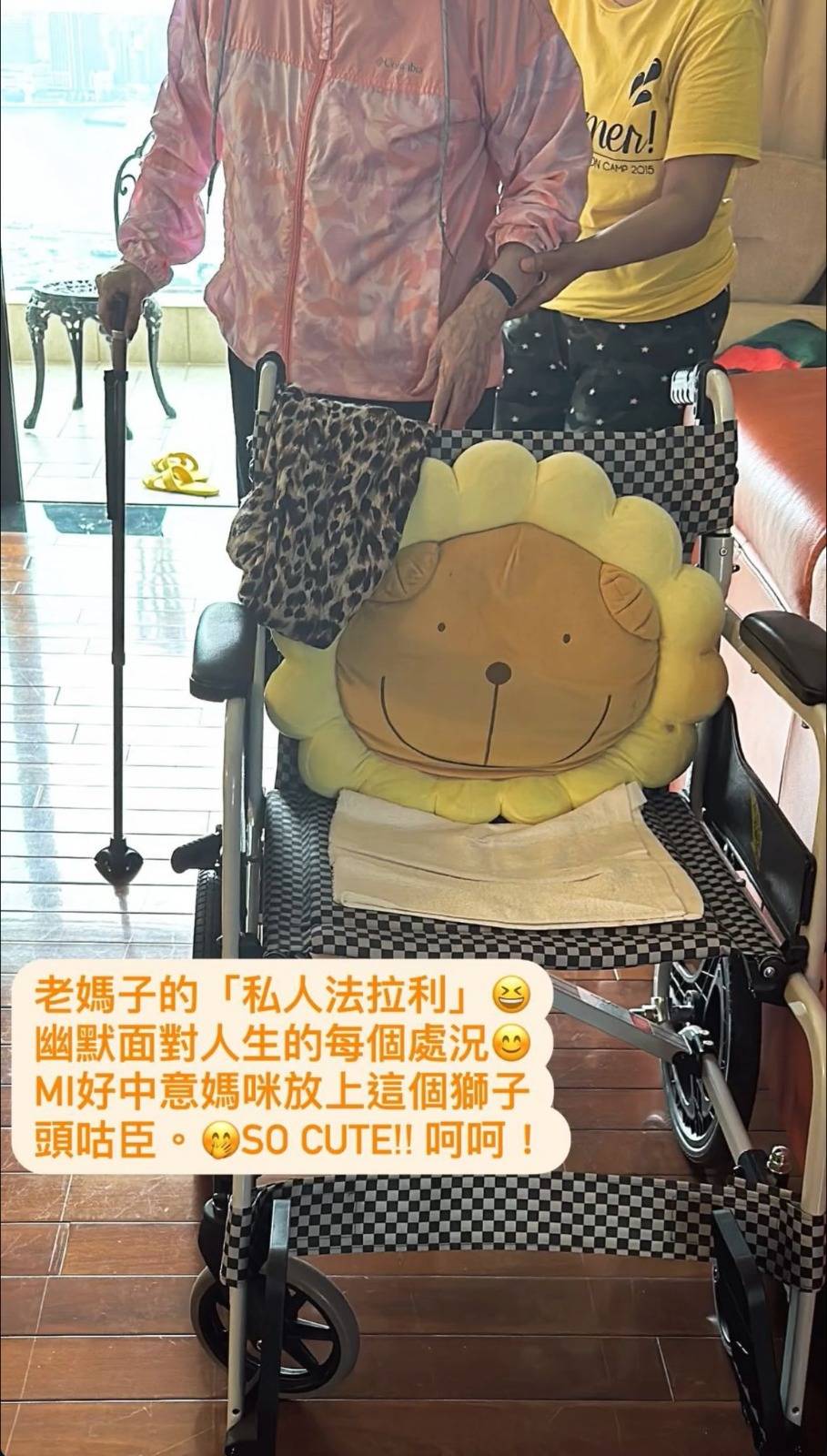 Sammi不時會喺社交平台分享工作點滴同生活軼事,近排佢都有談及年邁母親嘅身體狀況,一向非常孝順嘅Sammi,日前除咗同家人去咗拜亡父之外,亦有去探望媽媽,佢透露媽媽身體狀況尚未康復,所以未有同行去拜祭,之後更po出媽媽嘅輪輢,佢幽默寫道:「老媽子的『私人法拉利』,幽默面對人生的每個處況,MI好鍾意媽咪放上這個獅子頭咕臣。So cute 呵呵!」![]()