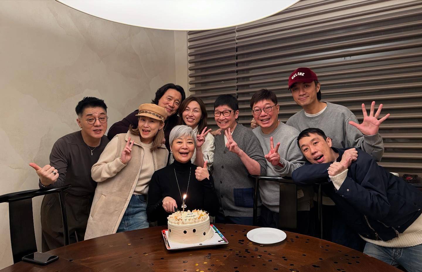 資深女演員金燕玲曾喺短短三年內兩度戰勝癌魔,近年復出過戲癮,喺《不日成婚2》飾演佳母、《破‧地獄》飾演蓮姐等,閒時就同一班老友聚會,相中見金燕玲一頭白色短髮,精神不錯,切蛋糕時更係笑容燦爛。