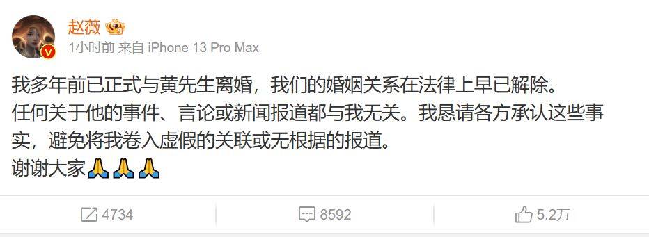 趙薇當年喺電視劇《還珠格格》飾演小燕子爆紅,噚日喺社交平台發文:「我多年前已正式與黃先生離婚,我們的婚姻關係在法律上早已解除。任何關於他的事件、言論或新聞報道都與我無關。我懇請各方承認這些事實,避免將我捲入虛假的關聯或無根據的報道。謝謝大家。🙏🙏🙏」