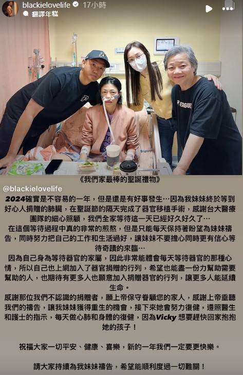 黑人同Vicky感情一向好好,妹妹病發住院接近一個月後終於可以出院,黑人唔止開車接送,由於妹妹肺功能差,黑人擔心妹妹行樓梯辛苦,仲親自揹妹妹上樓,篤信基督教嘅黑人,日日幫妹妹祈禱,希望可以等到合適嘅捐贈者,皇天不負苦心人,黑人喺2024年最後一日宣布妹妹手術成功嘅好消息,仲post出一家人喺醫院嘅合照,開心迎接充滿希望嘅2025。
