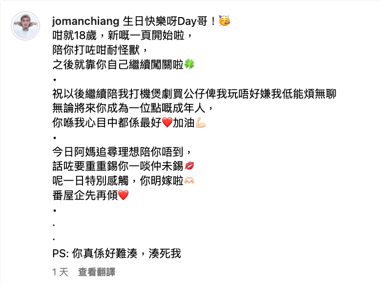 Joman由Day兩歲半開始就照顧佢,一直視對方如己出,只要唔使工作嘅時間都會陪住對方,眨吓眼Day已經18歲成為男人,難怪Joman亦甚為感觸,佢喺帖文中寫道:「生日快樂呀Day哥!🥳咁就18歲,新嘅一頁開始啦,陪你打咗咁耐怪獸,之後就靠你自己繼續闖關啦🍀祝以後繼續陪我打機煲劇買公仔俾我玩唔好嫌我低能煩無聊,無論將來你成為一位點嘅成年人,你喺我心目中都係最好❤️加油💪🏻」![]()