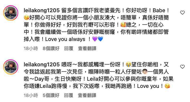 而喺文尾Joman仲加咗句「PS:你真係好難湊,湊死我」可以話係超級洋蔥,就連Joman嘅「B餐老公」唐寧睇完都忍唔住留言:「喂呀~我都感觸埋一份呀!😭望住你啲相,又令我諗返起我第一次見佢,嗰陣時嗰一粒人仔變咗👦🏻一個男人啦~Day哥,生日快樂呀!Leila好開心可以參與你嘅童年,如果你唔嫌Leila跑得慢,我下次返嚟,我哋再跑過!Love you!😘」![]()
