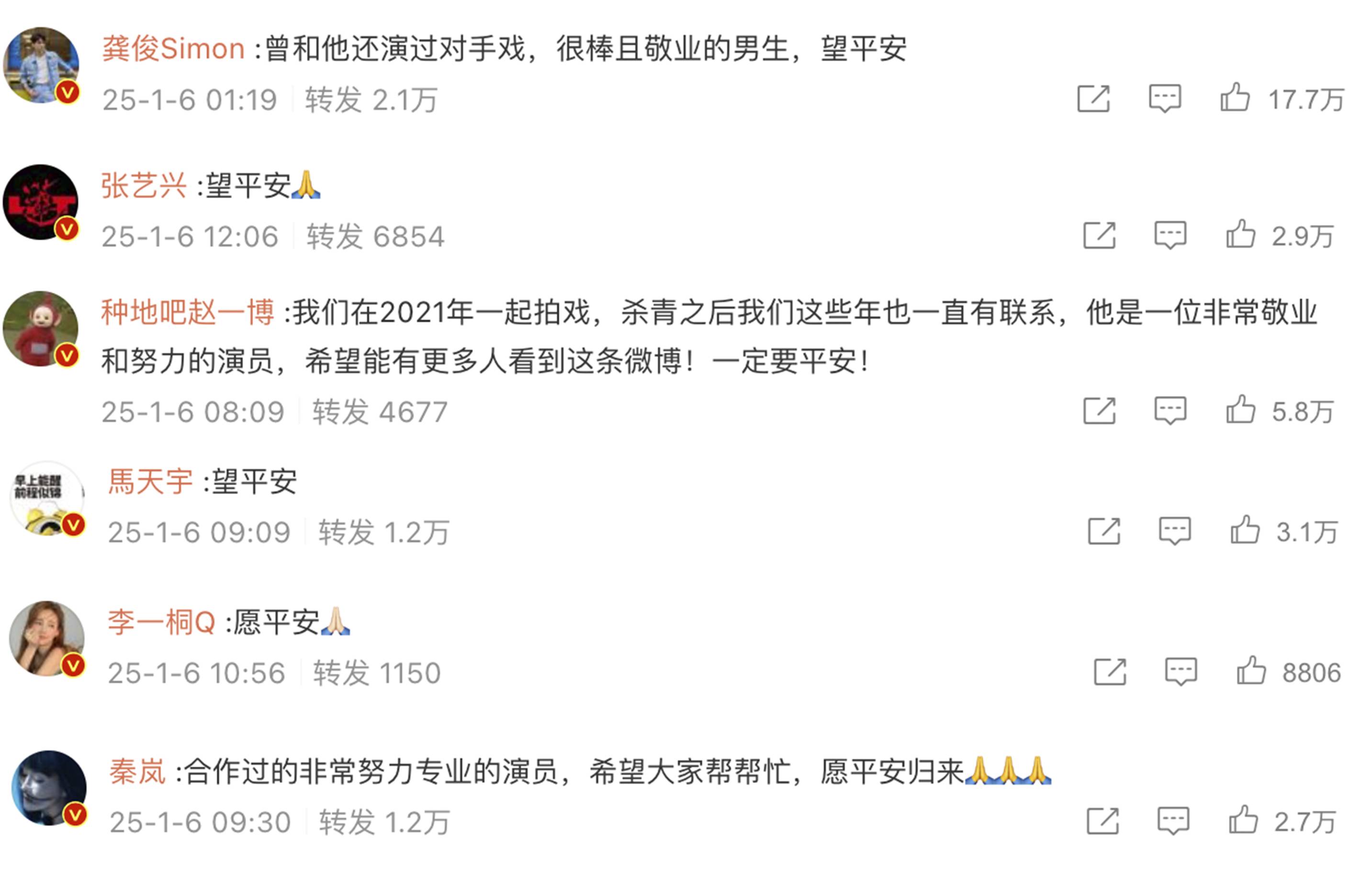 同嘉嘉合作過嘅龔俊、秦嵐、趙一博亦有轉發嘉嘉嘅求救文,又分別表示:「曾和他還演過對手戲,很棒且敬業的男生,望平安」、「合作過的非常努力專業的演員,希望大家幫幫忙,願平安歸來」、「我們在2021年一起拍戲,殺青之後我們這些年也一直有聯繫,他是一位非常敬業和努力的演員,希望能有更多人看到這條微博!一定要平安!」,張藝興、馬天宇、李一桐等演員亦有出力轉發文章,希望星星平安回國。