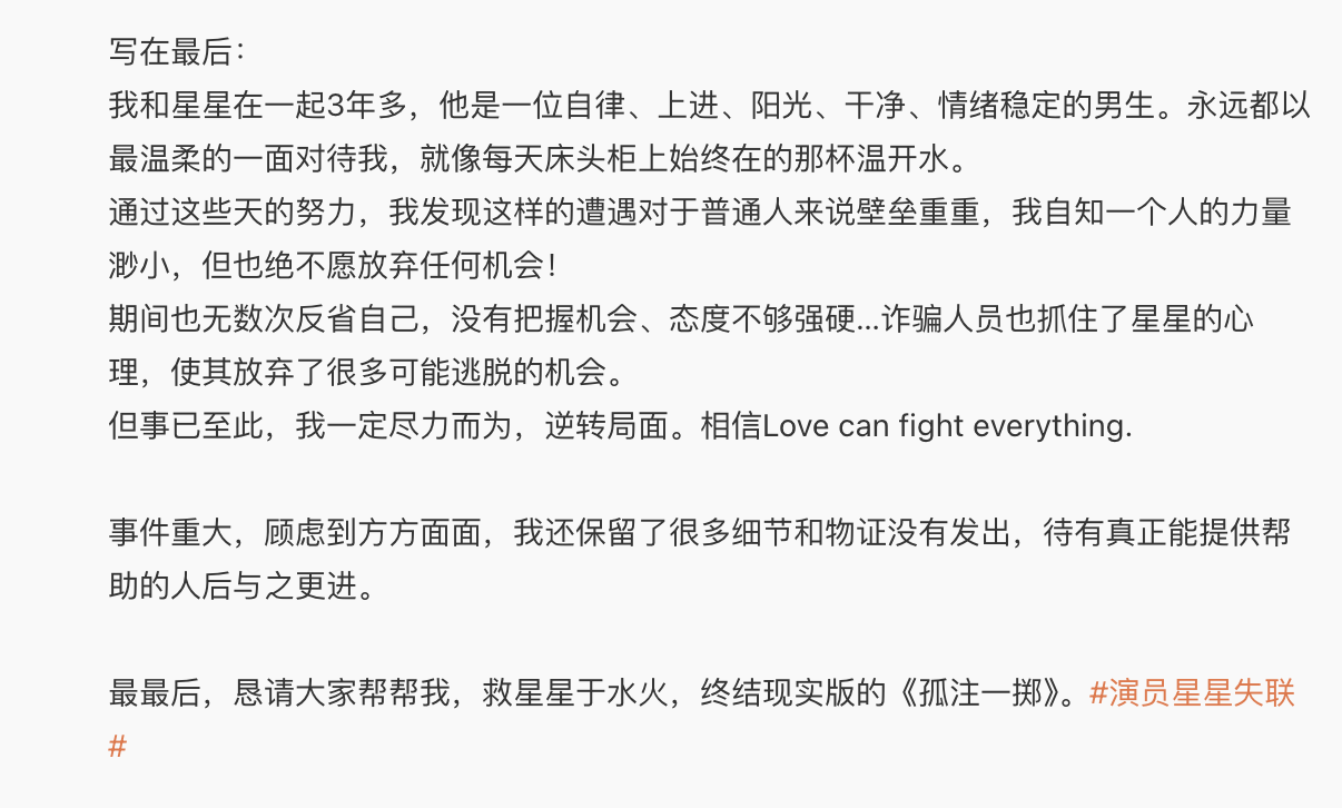 星星出發前曾一度質疑拍攝資訊、拍攝地點而想拒絕,但是遭對方暴怒爆粗仲表示:「抓緊時間,爭取我這邊實在換不了人」令星星妥協。 嘉嘉喺長文分享最後男友行蹤,指星星由1月3日北京時間4點(曼谷時間:3點),由上海直飛q泰國曼谷蘇萬那普機場,之後乘搭由演員統籌安排嘅車輛,1月3日凌晨至中午,兩人一直保持聯絡,星星喺接近中午時曾透露「上車了,因為上一輛車交接了。」、「五分鐘(到開機儀式)。」而女友之後再聯絡已經搵唔到人。![]()