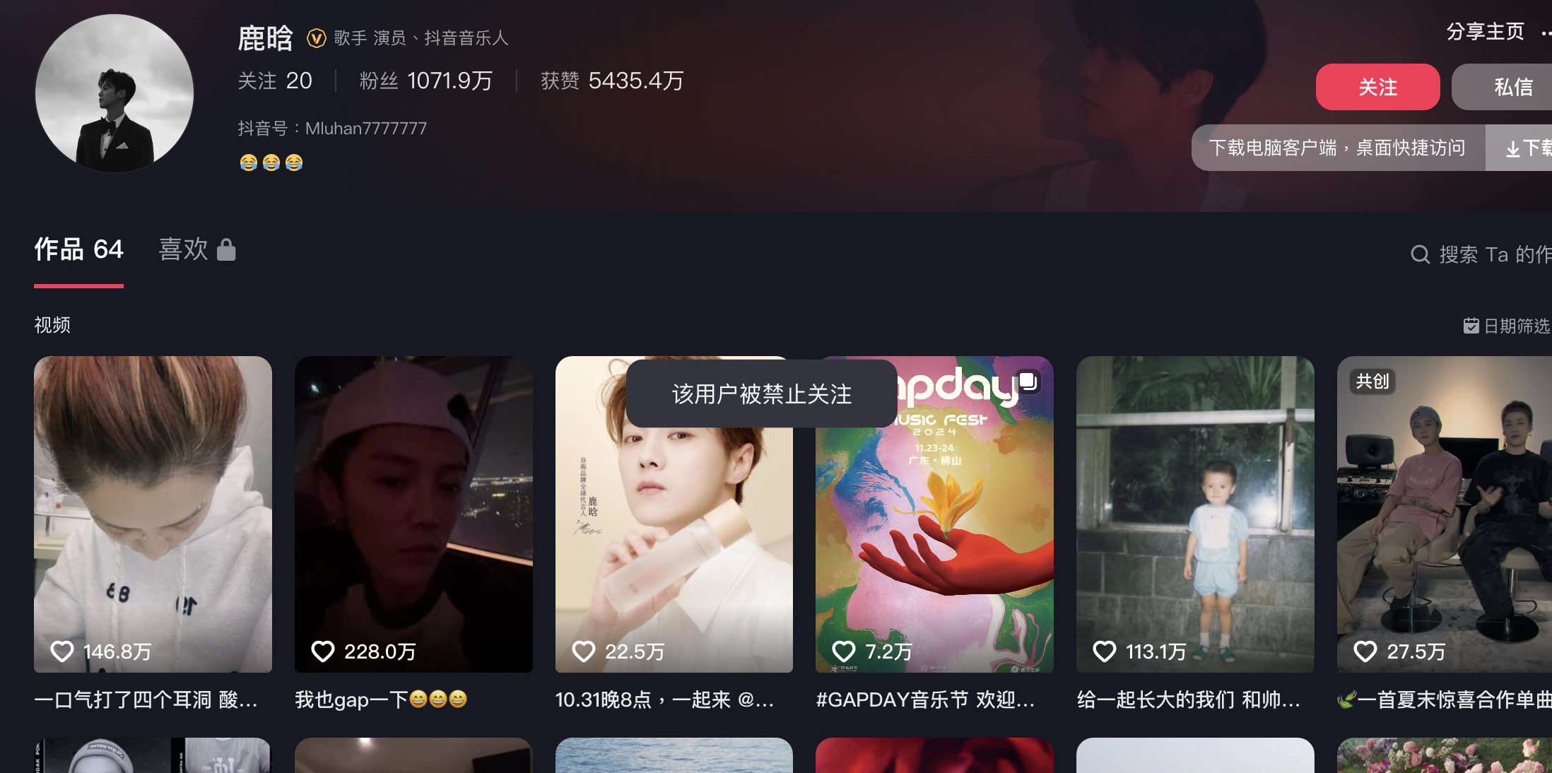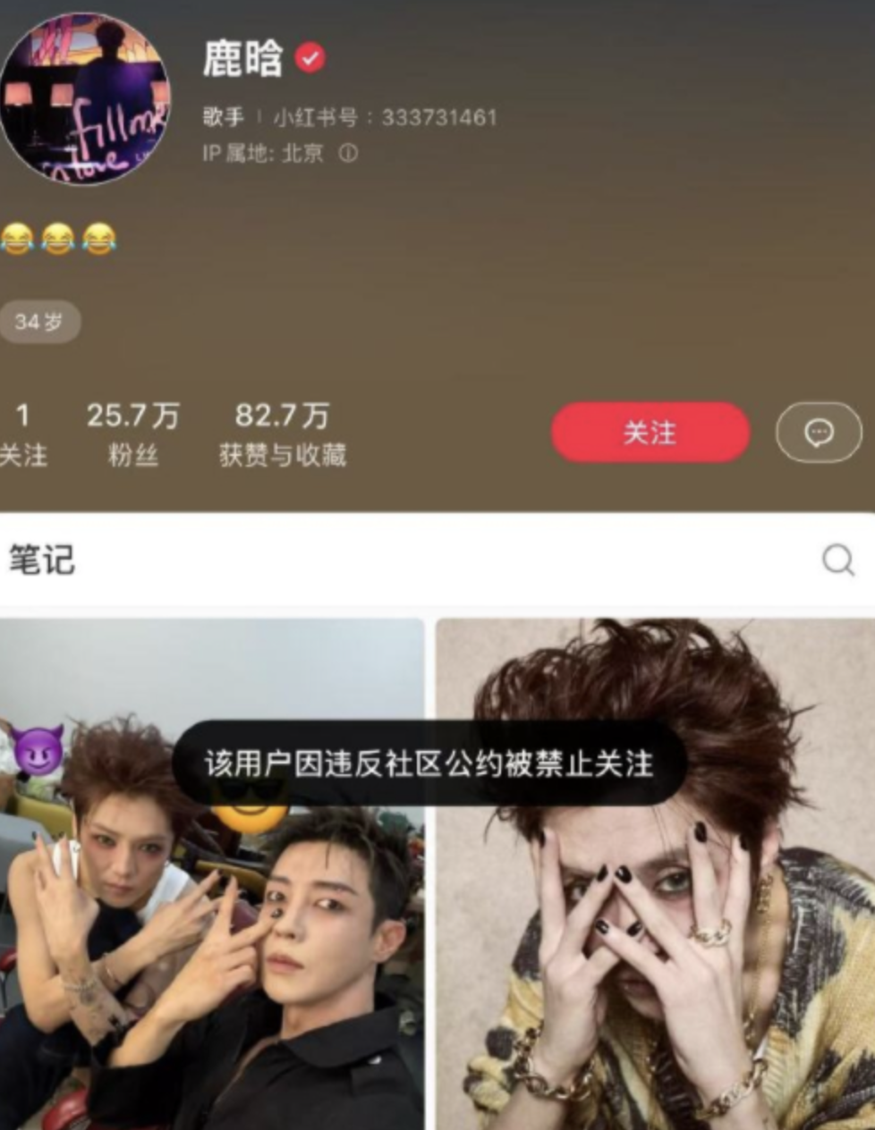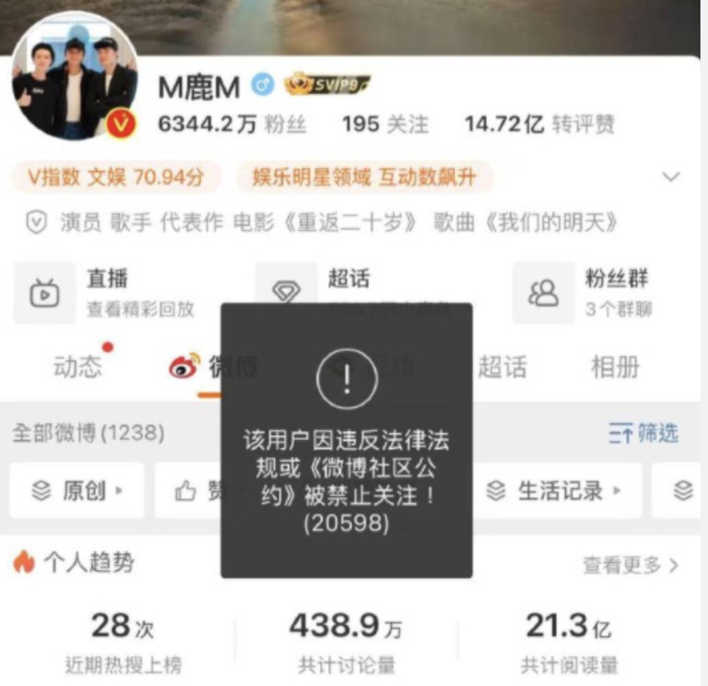 不過喺1月6號下午時分,內地社交平台就有人發現,鹿晗嘅網上各個平台帳號都同時受到限制禁止關注,並且按下關注後仲會顯示「違反法律法規」字眼,令唔少粉絲同網民大感震驚,擔心鹿晗係涉及嚴重事件被封禁,呢件事更衝上社交平台熱搜榜第一位。