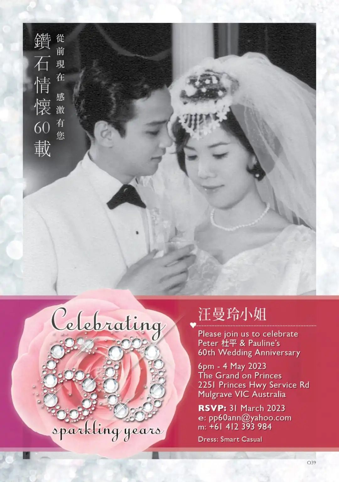 年前杜平為慶祝同太太結婚60周年鑽石婚,當時廣邀親朋好友飛往澳洲參加慶祝派對,邀請超過200名賓客到場;筵開23席。大批香港演藝圈好友包括當年EYT拍檔修哥胡楓、蔡和平夫婦、森森、吳麗珠、鄧英敏、梁碧玲、溫兆倫及杜平契妹翁虹,而大王安德尊專程向劇組請假飛抵當地道賀。