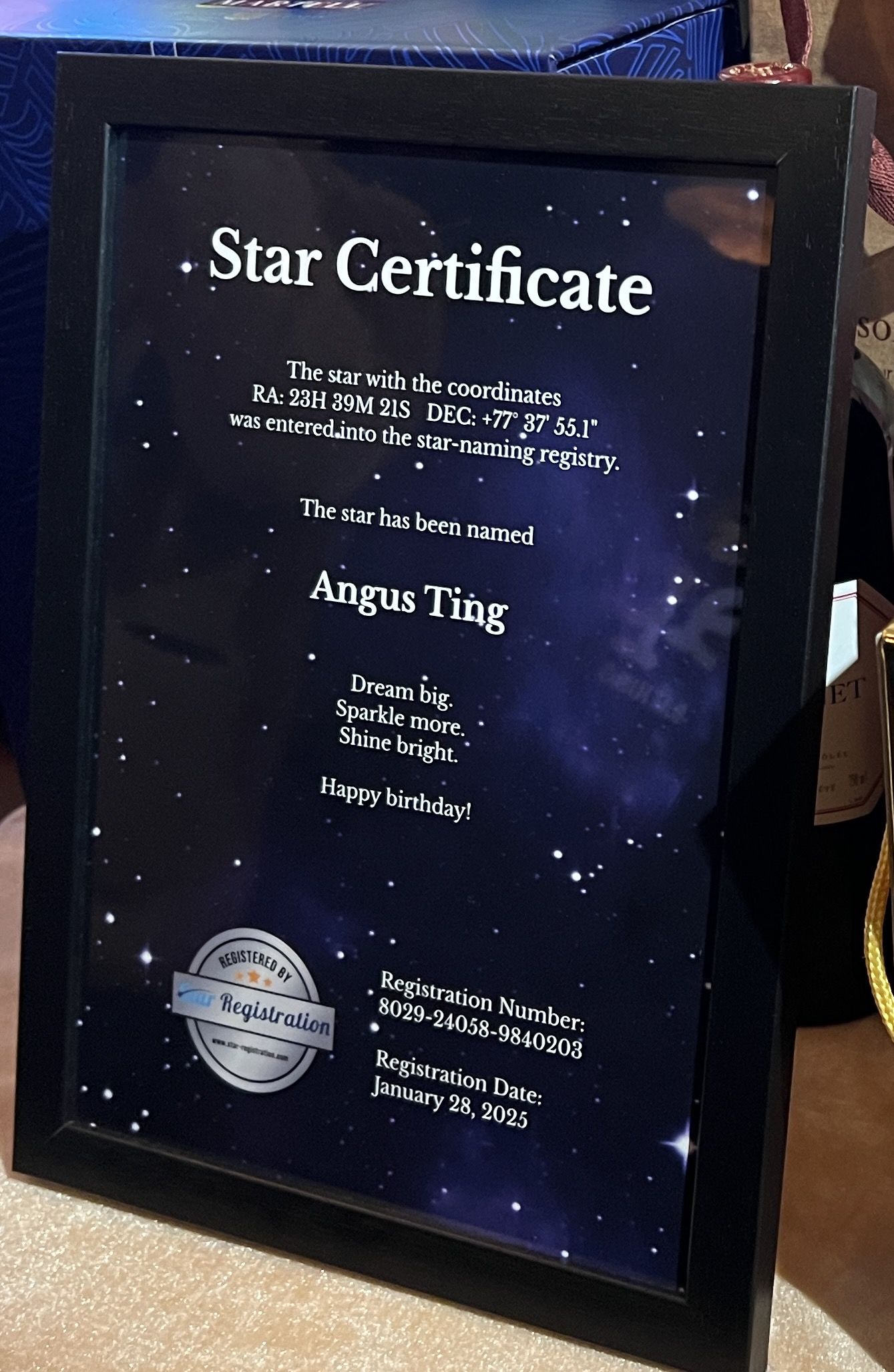 一眾愛丁寶亦製作驚喜影片同送上禮物祝賀,唔少Fans亦送上各式各樣美酒,有歌迷仲以「Angus Ting」字為一顆星命名,寓意佢星途燦爛,事業一飛沖天,別具心思。![]()