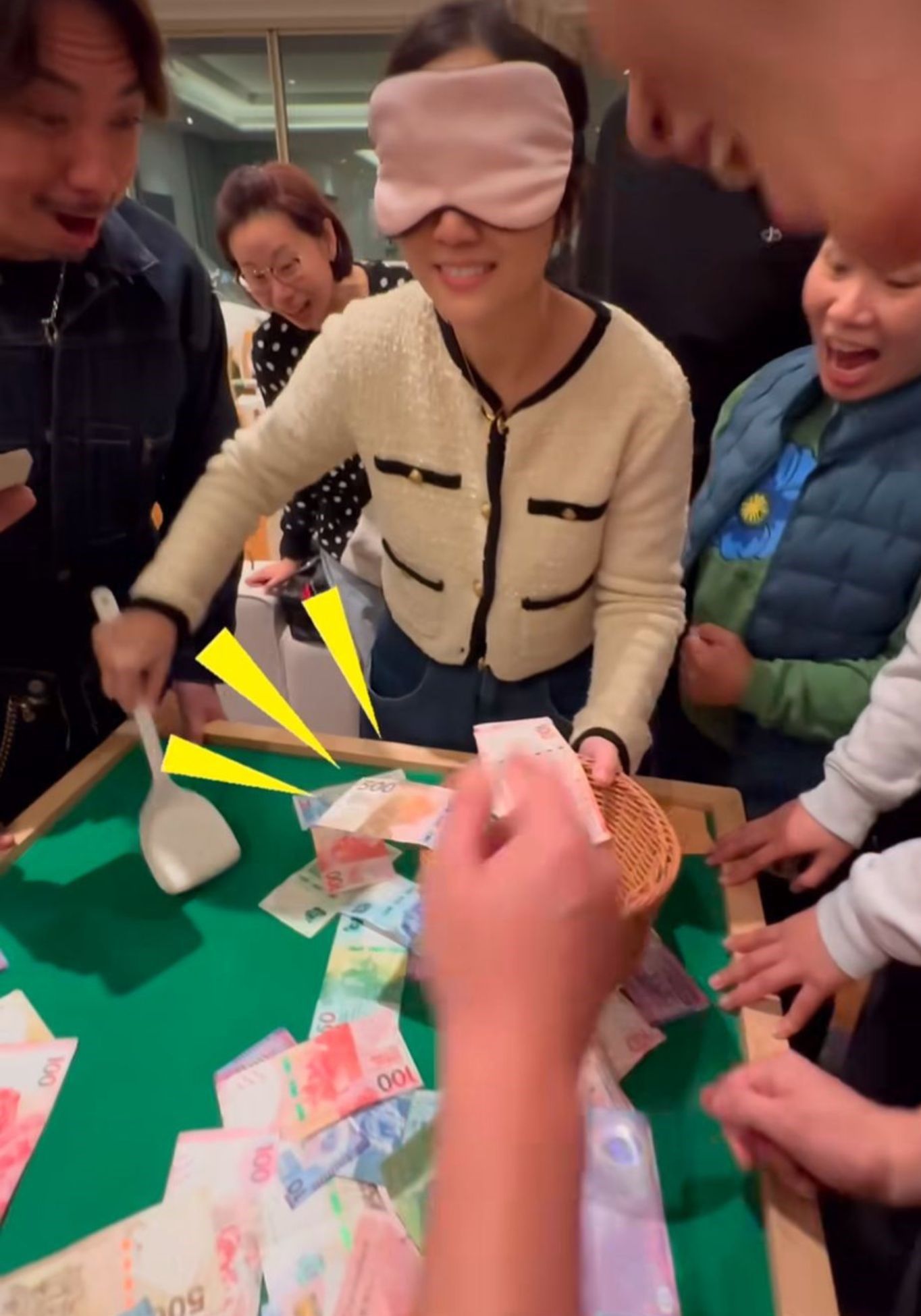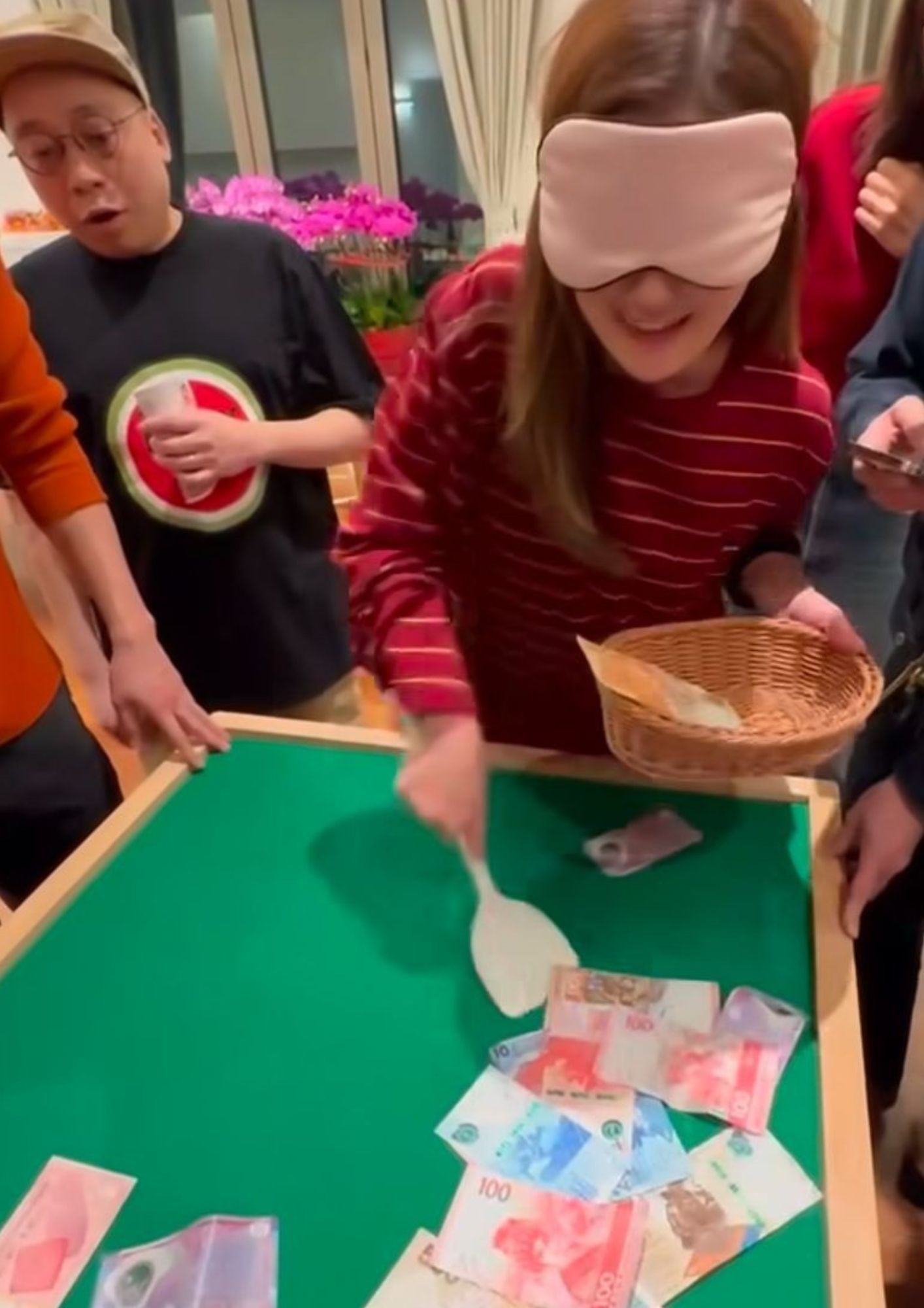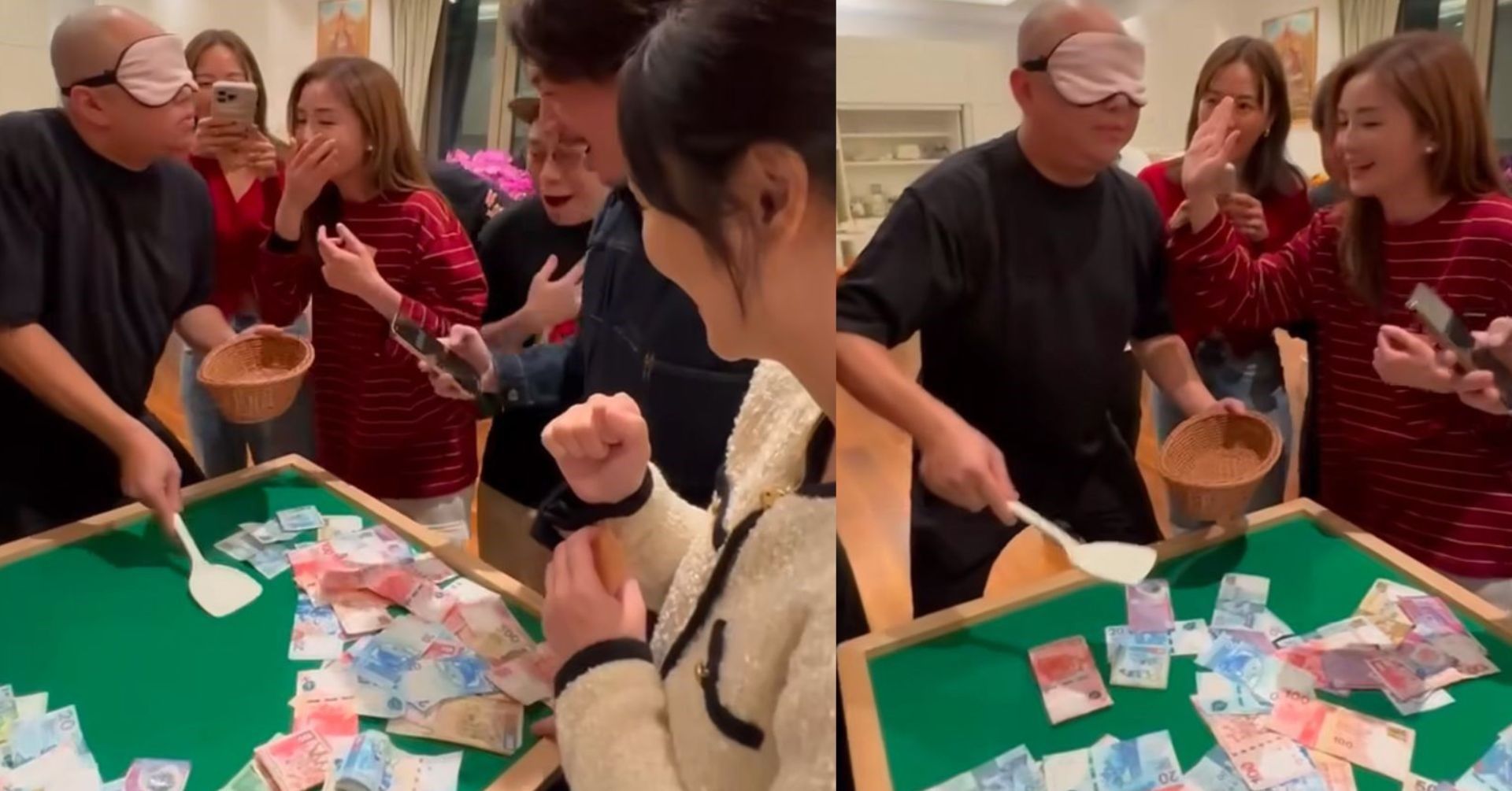 另一條影片見戴上眼罩嘅阿Sa,好淡定將1000蚊紙鏟起並放入籃,佢見鏟到錢即興奮料尖叫,並喺社交平台寫道:「Sorry阿Bob攞咗你1000,但係你真係笑死我,綜藝之王非你莫屬🤣,真係祥賭必贏😝😝😝😝,今個新年真開心,全年keep住開開心心。」