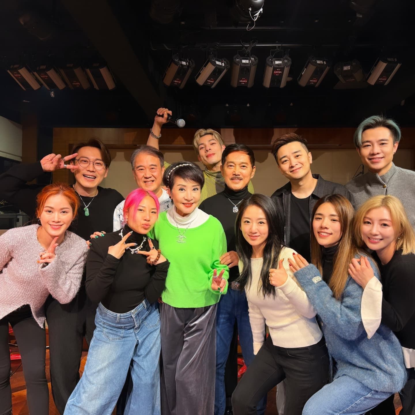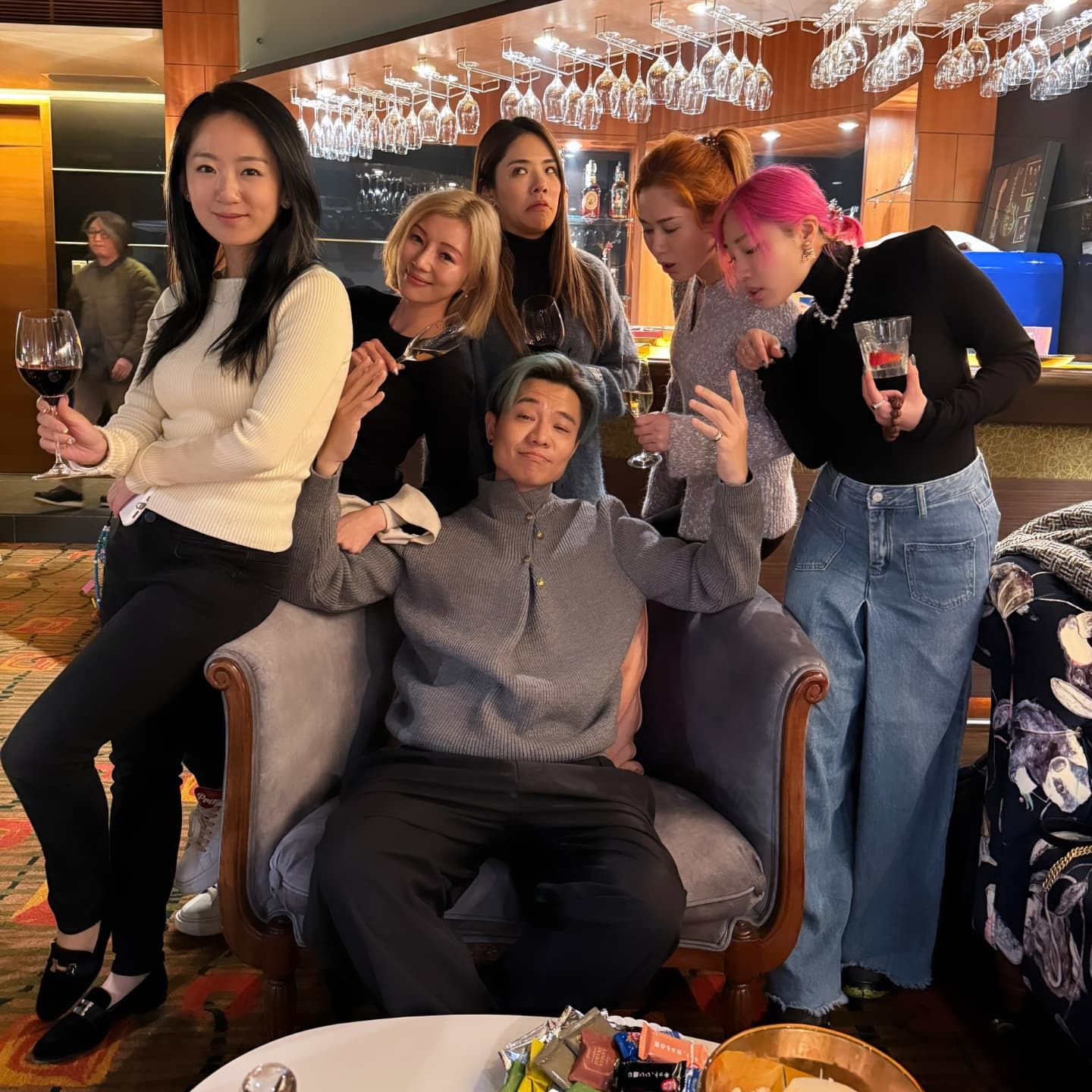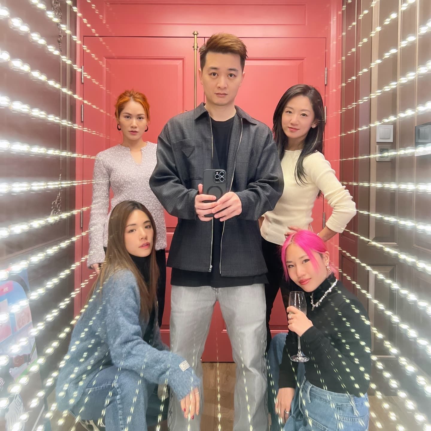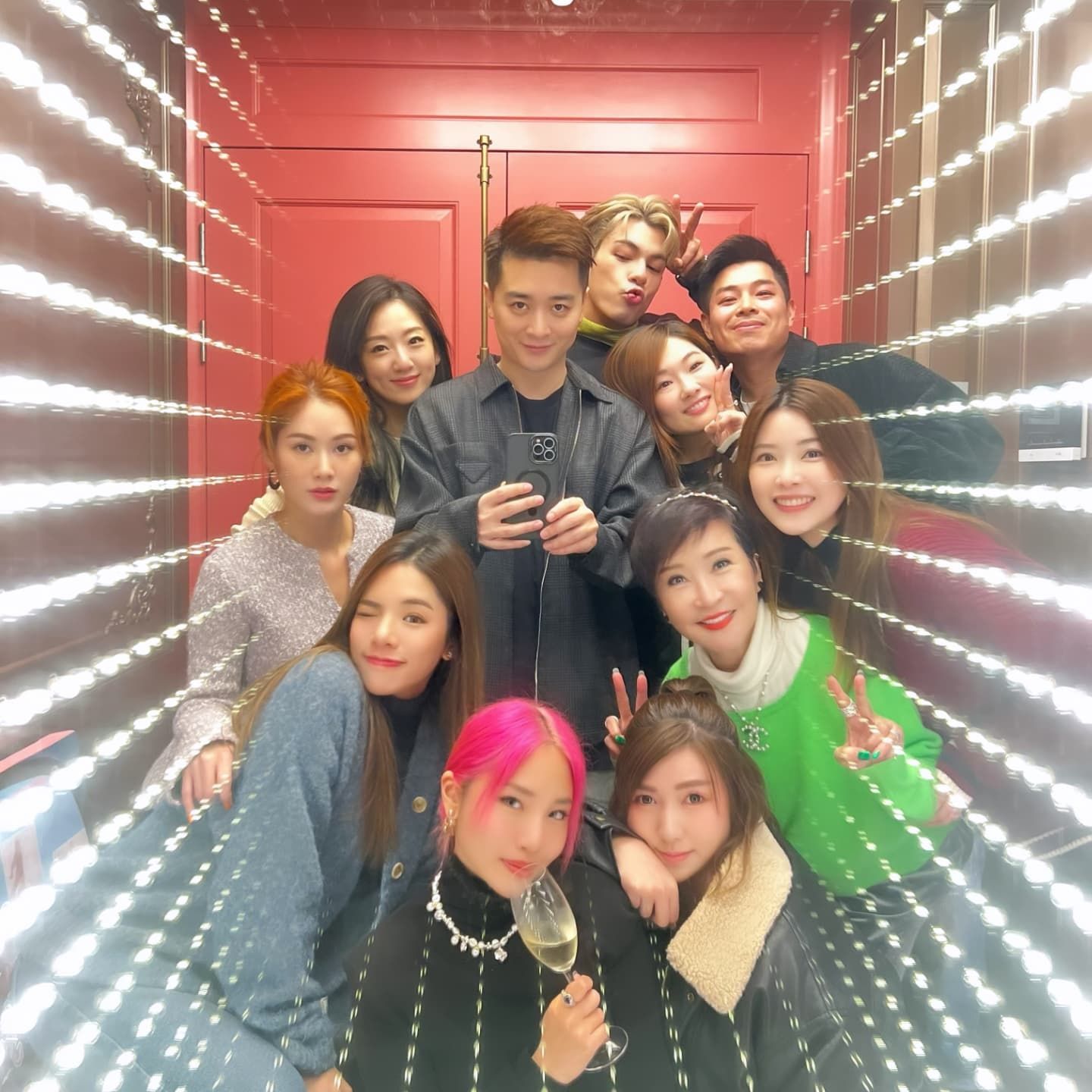 當日着上螢光綠色外套嘅拉姑非常亮眼,而鬍鬚Kong江耀城亦做「跟得先生」同老婆一齊出席飯局,佢哋仲同「中二生」一齊影對鏡自拍,玩得非常開心。