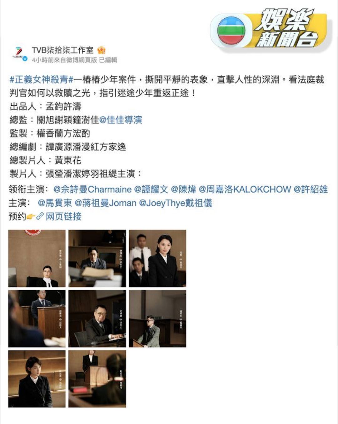 由佘詩曼、譚耀文、陳煒、周嘉洛、許紹雄、馬貫東、蔣祖曼及戴祖儀等主演嘅新劇《正義女神Themis》早前殺青,官方微博「TVB柒拾柒工作室」於20號晒出8位主演嘅單人海報,以及佘詩曼演繹法庭裁判官嘅一分鐘片花。![]()