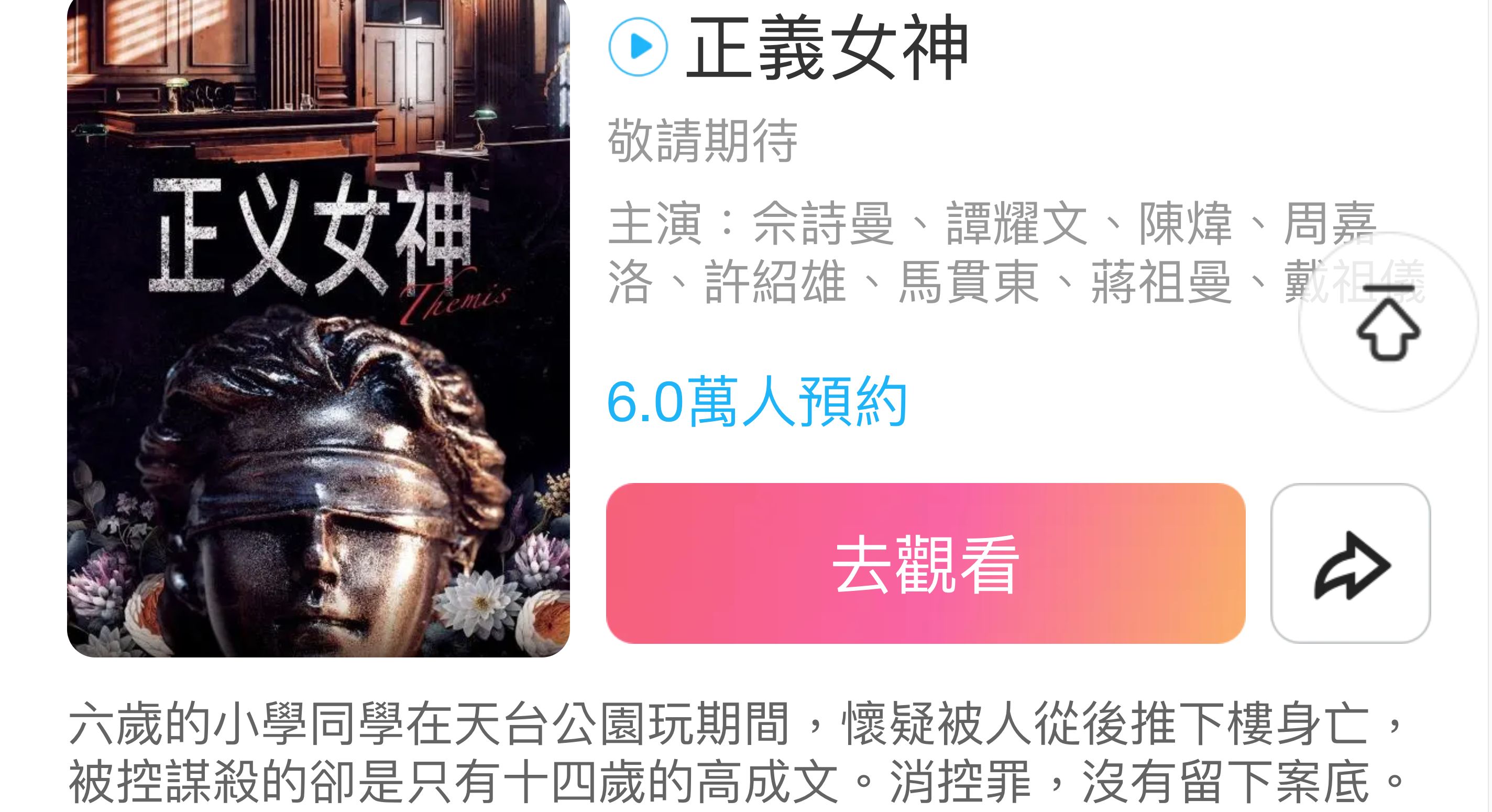 雖然《正義女神Themis》剛殺青冇耐,仲未有確實開播日期,不過已經有逾6萬人預約想睇呢套劇,唔少網民都留言話期待,希望可以快啲播出呀!![]()