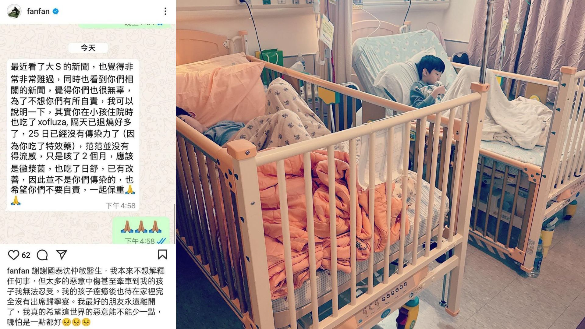 對於網民指責,范范於21日喺社交平台上載跟醫生對話截圖,內容係醫生指范范一家人無辜,因為小孩於1月25日已沒有傳染力,范范無患上流感,只係咳咗兩個月,應該係黴漿菌,因此並唔會係由范范一家傳染。范范喺帖文稱本來唔想解釋任何事,但太多惡意中傷甚至牽連到孩子,無法忍受「我的孩子痊癒後也待在家裡,完全沒有出席歸寧宴。我最好的朋友永遠離開了,我真的希望這世界的惡意能不能少一點,哪怕是一點都好」,不過貼文一出,引起不少人轉發及熱議,范范喺同日中午突然刪走帖文。
