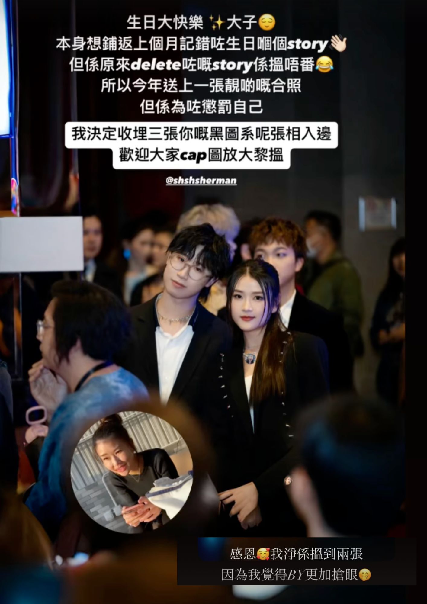 Felix喺社交平台限時動態出Post,先係祝壽星女生日快樂,然後就話:「本身想鋪(Post)返上個月記錯生日嗰個Story,但係原來delete咗嘅Story係搵唔番。所以今年送上一張靚啲嘅合照。但係為咗懲罰自己,我決定收埋三張你嘅黑圖系(喺)呢張相入邊,歡迎大家cap圖放大黎搵。」