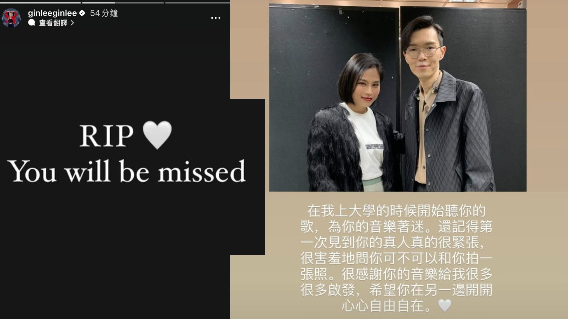 Gin Lee則貼出二人合照:「在我上大學的時候,開始聽你的歌,為你的音樂著迷。還記得第一次見到你的真人,真的很緊張,很害羞地問你可不可以和你拍一張照。很感謝你的音樂給我很多啟發,希望你在另一邊開開心心自由自在。」