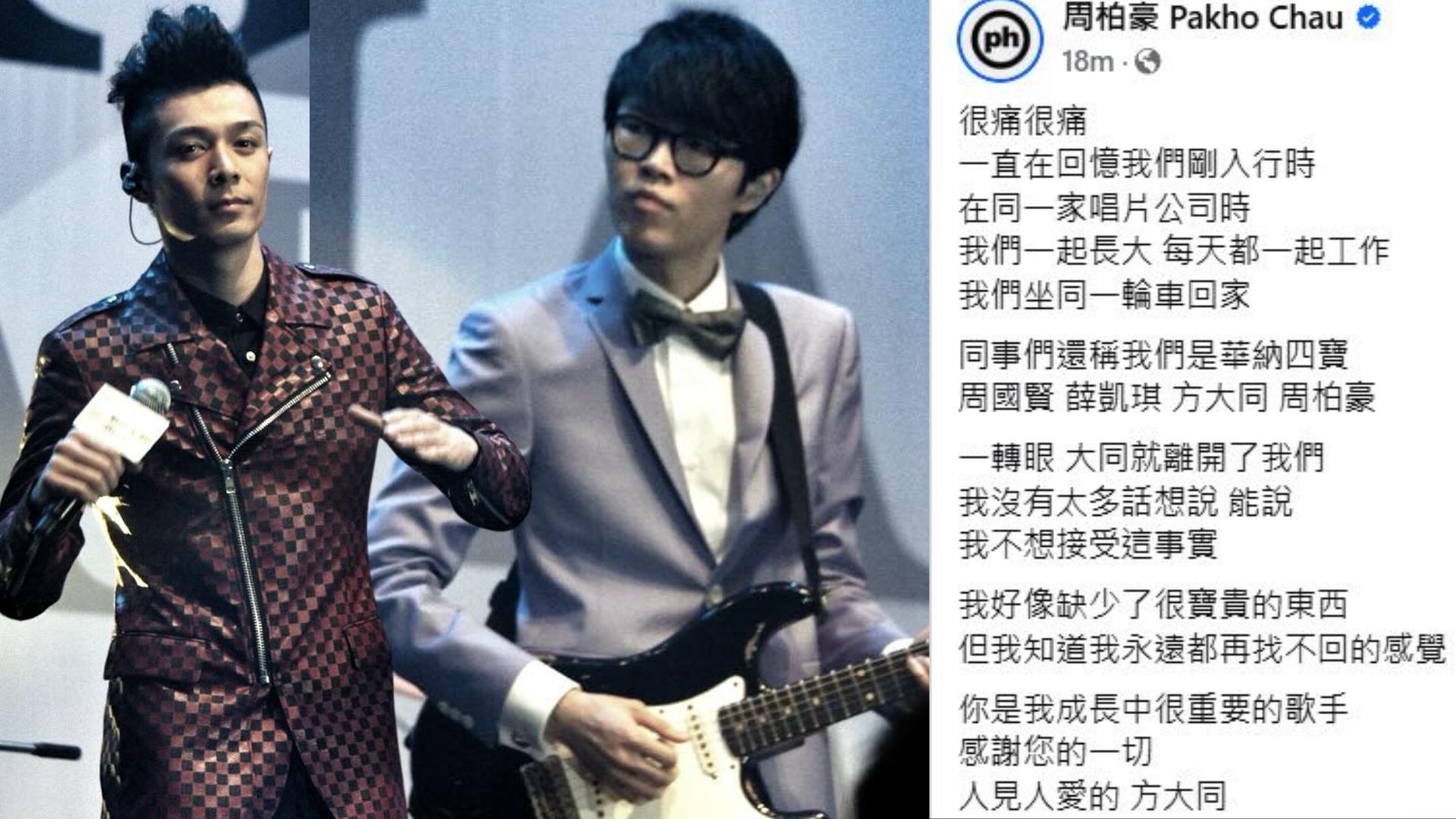 周柏豪與方大同當年加入同一家唱片公司,彼此一齊長大,對於方大同突然離世,柏豪表示好心痛,腦海裡面一直想起他們剛入行的回憶:「很痛很痛,一直在回憶我們剛入行時,在同一家唱片公司時,我們一起長大,每天都一起工作,我們坐同一輪車回家,同事們還稱我們是『華納四寶』周國賢、薛凱琪、方大同、周柏豪;一轉眼,大同就離開了我們,我沒有太多話想說,我不想接受這事實,我好像缺少了很寶貴的東西,但我知道我永遠都再找不回的感覺,你是我成長中很重要的歌手,感謝您的一切,人見人愛的方大同。」